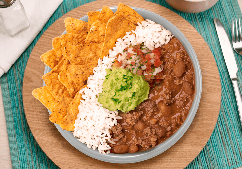 Bowl con porción extragrande de chili con carne (un poco picante), guacamole, pico de gallo, nachos y arroz blanco.