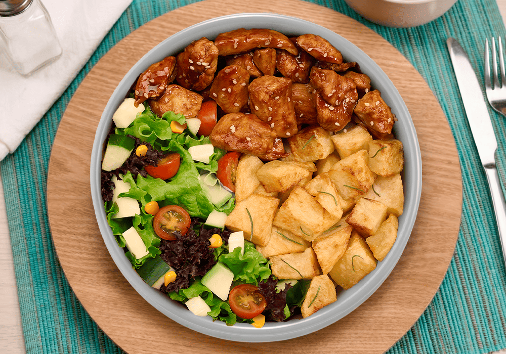 Bowl con porción extragrande de pollo teriyaki con ajonjolí, papas al horno, ensalada con lechuga, tomate cherry, pepino, zucchini y vinagreta de aceite de oliva y balsámico.