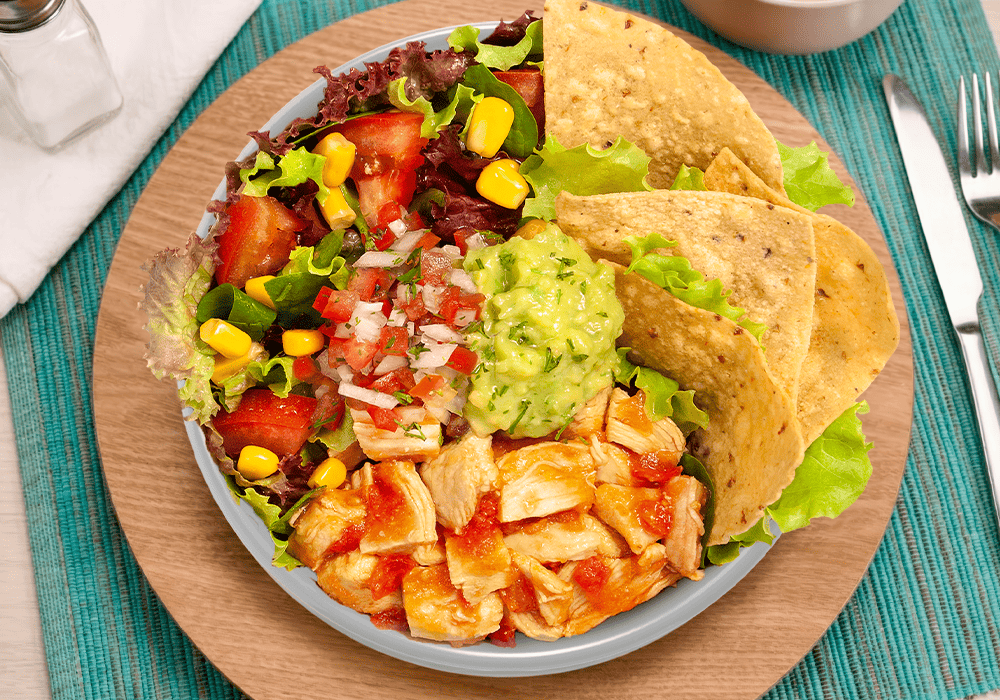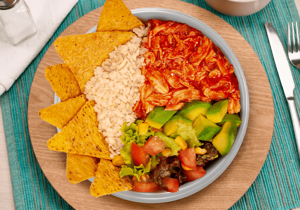 Bowl con porción extragrande de pollo en preparación mexicana (un poco picante), lechuga,tomate,maíz, aguacate,nachos, arroz integral y salsa de la casa. *Salsa de la casa: mayonesa de cilantro.