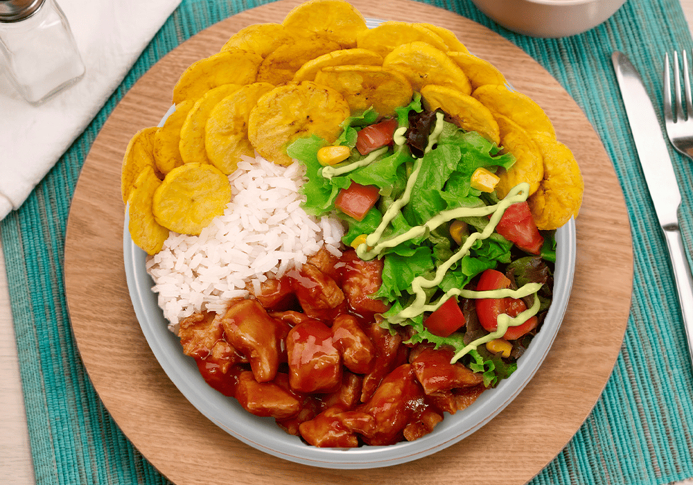Bowl con porción extragrande de pollo en salsa agridulce, ensalada con lechuga, tomate, maíz salteado, arroz blanco, moneditas de plátano y salsa de la casa. *Salsa de la casa: mayonesa de cilantro.