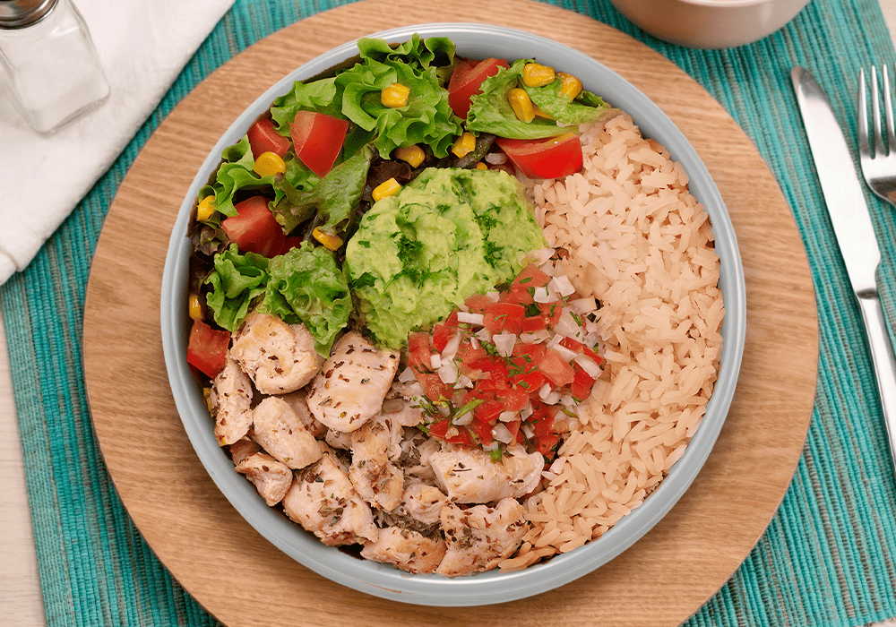 Bowl con porción extragrande de pollo a las finas hierbas, ensalada con lechuga, tomate,maíz salteado, guacamole, pico de gallo, arroz integral y salsa de la casa. *Salsa de la casa: mayonesa de cilantro.