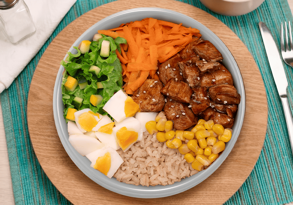 Bowl con porción extragrande de pollo teriyaki y ajonjolí, lechuga, zucchini, maíz, zanahoria, huevo, arroz integral y salsa de la casa. *Salsa de la casa: mayonesa de cilantro.