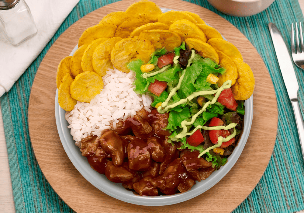 Bowl con porción extragrande de cerdo en salsa agridulce, ensalada con lechuga, tomate, maíz salteado, arroz blanco, moneditas de plátano y salsa de la casa. *Salsa de la casa: mayonesa de cilantro.