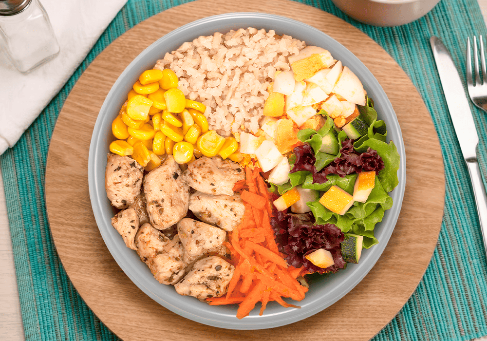 Bowl con porción extragrande de pollo a las finas hierbas, lechuga, zucchini, maíz, zanahoria, huevo, arroz integral y salsa de la casa. *Salsa de la casa: mayonesa de cilantro