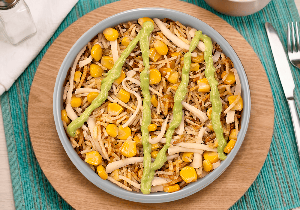 Bowl con porción extragrande de pollo en salsa tinga (un poco picante), maíz salteado, queso mozzarella, papa ripio, y salsa de la casa. *Salsa de la casa: mayonesa de cilantro.