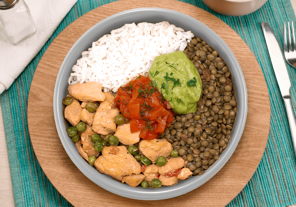 Bowl con porción extragrande de pollo en cocción con vegetales, lentejas, acompañado de maduro,hogao, guacamole y arroz blanco.