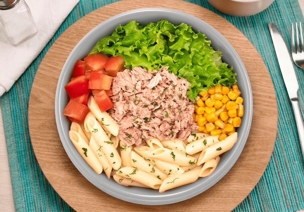 Bowl con porción extragrande de atún con mayonesa y cilantro, pasta penne, tomate, lechuga, maíz, guacamole y salsa de la casa. *Salsa de la casa: mayonesa de cilantro.