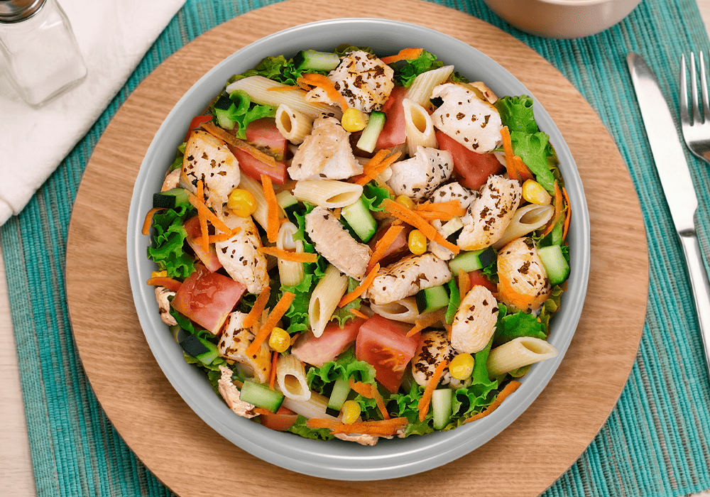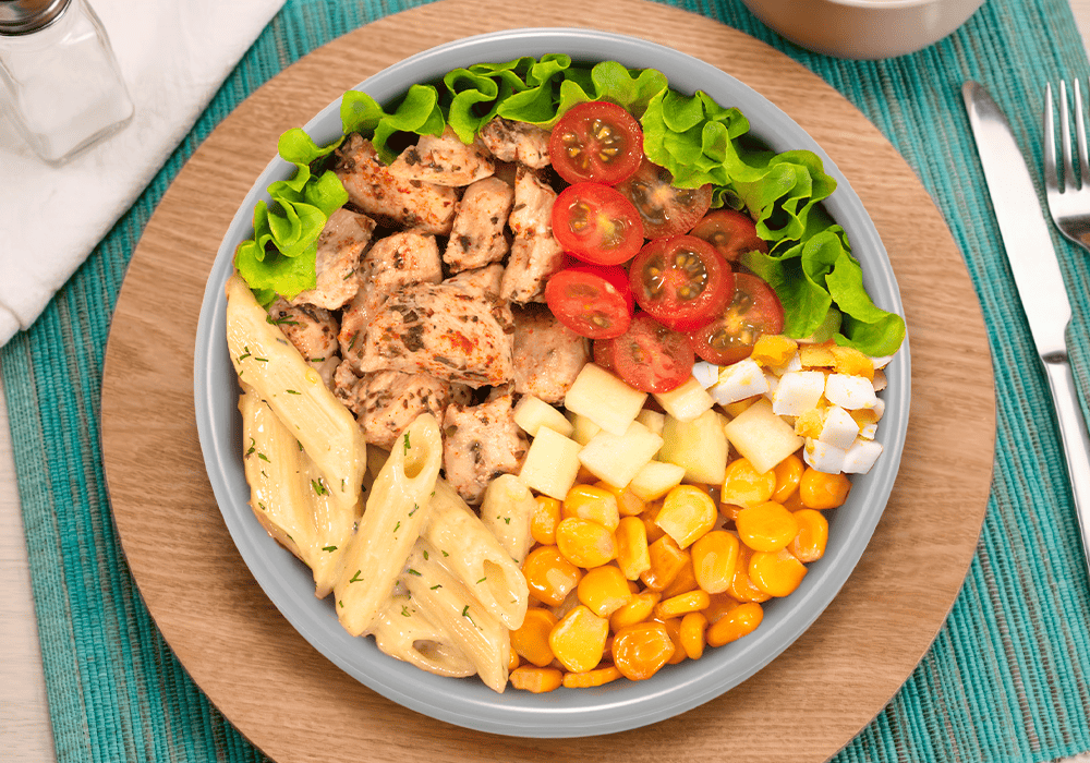 Bowl con porción extragrande de pollo finas hierbas, lechuga,pasta penne con mayonesa y cilantro, tomate cherry, mozzarella, maíz, huevo y salsa de la casa. *Salsa de la casa: mayonesa de cilantro