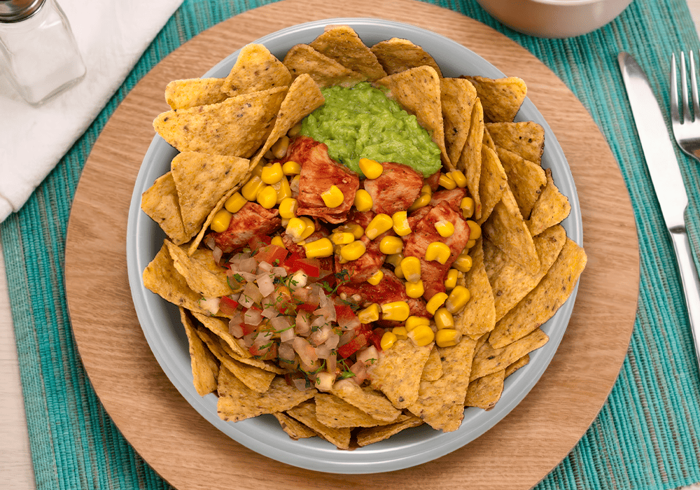 Bowl con porción extragrande de nachos con pollo en salsa tinga (un poco picante), maíz, pico de gallo y guacamole.