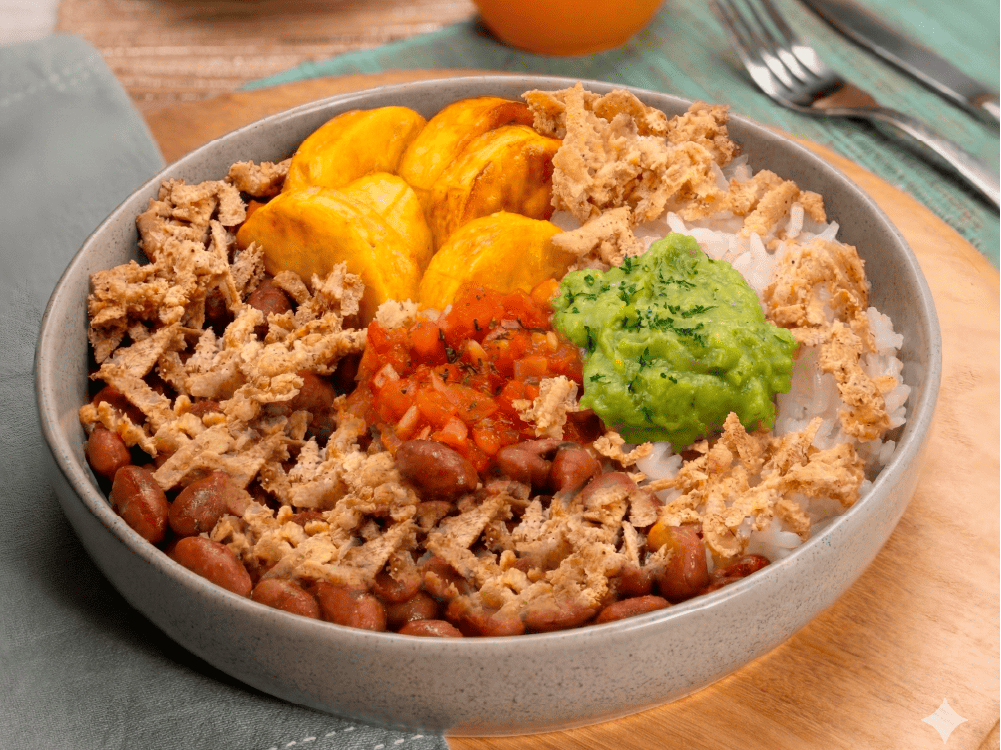 Bowl vegetariano con tofu crujiente rallado y hecho al horno acompañado de frijol rojo, arroz blanco, maduro, guacamole y hogao.
