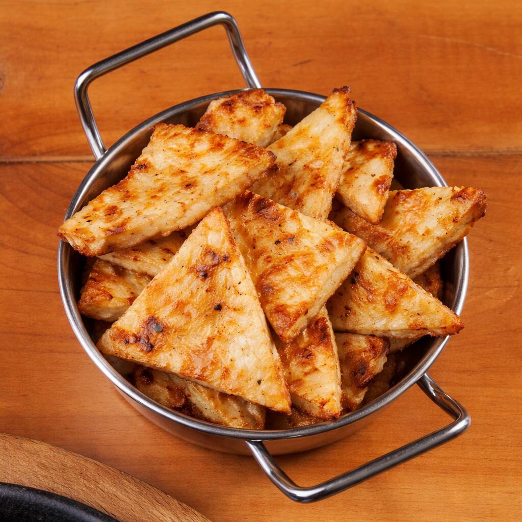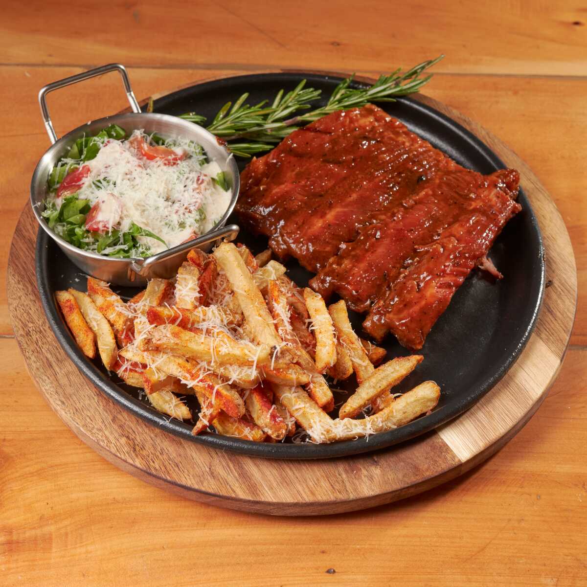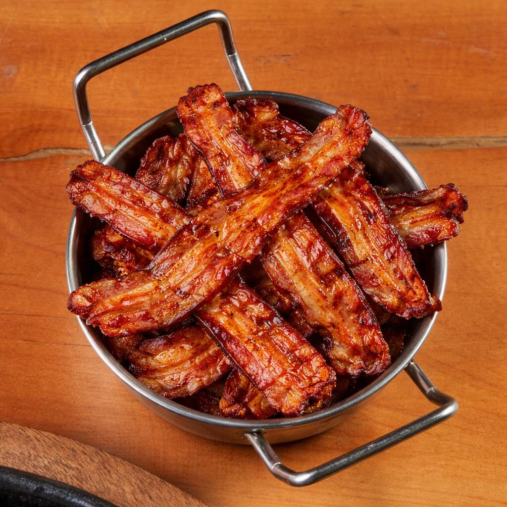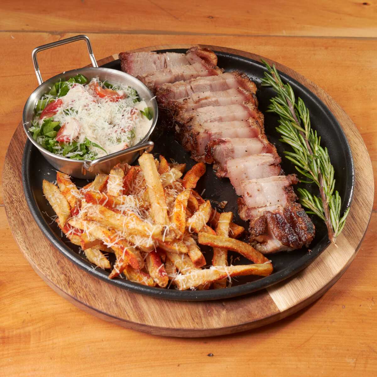 250 G de tocino ahumado a fuego lento, sellado a la parilla con mantequilla de ajo y romero, para obtener una capa exterior crujiente y una parte interior suave y jugosa; acompañado de 2 guarniciones a elección.