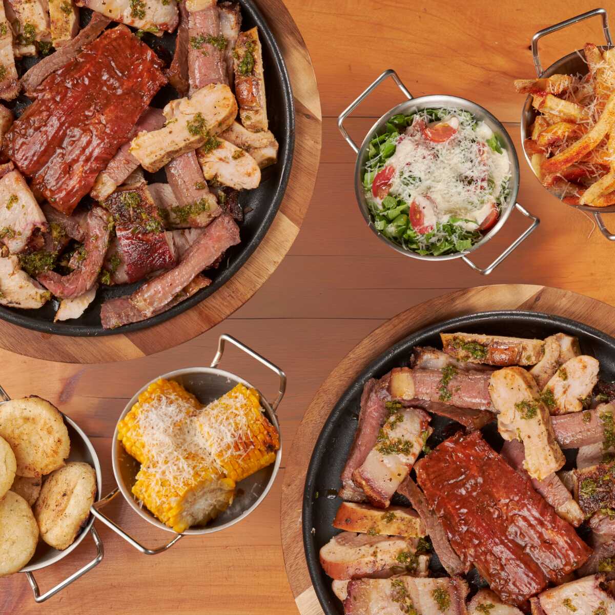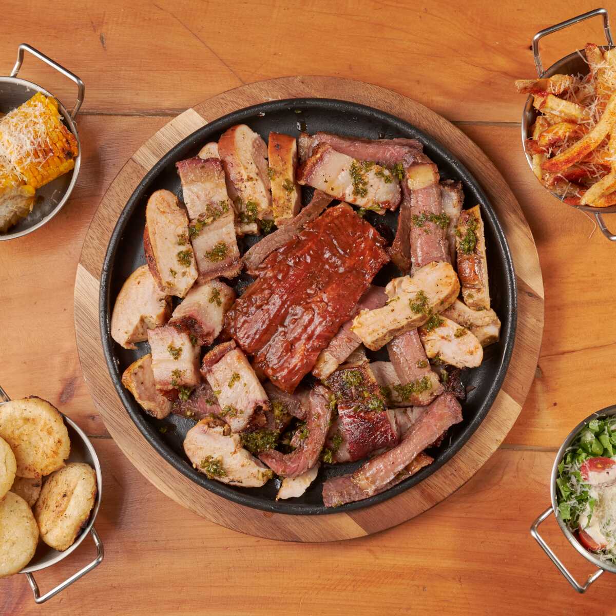 Para compartir - 500 g de nuestros 4 cortes estrella: pechuga, tocino y punta de anca ahumados y sellados a la parrilla, más costillas st. louis ahumadas 6 h a fuego lento; incluye 2 guarniciones a elección.
