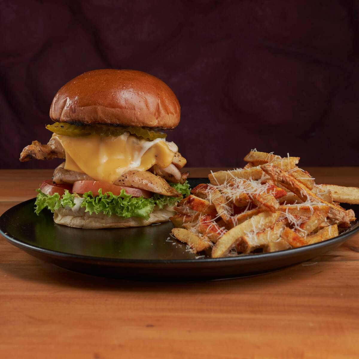 Pan artesanal, pechuga de pollo ahumada de 180 g, doble queso cheddar, pepinillos, lechuga, tomate y nuestra salsa de la casa; acompañada de papas a la francesa.