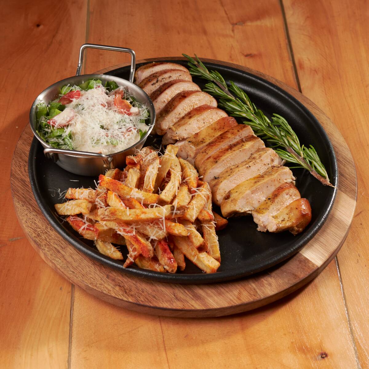 250 G de pechuga de pollo ahumada a fuego lento, sellada a la parilla con mantequilla de ajo y romero; acompañada de 2 guarniciones a elección.