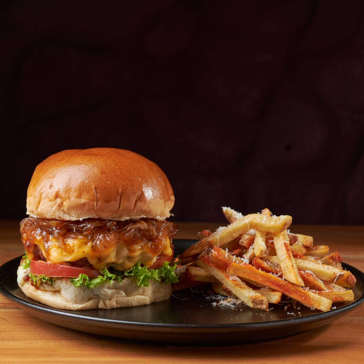 Pan artesanal, carne de res ahumada de 180 g, queso cheddar, cebolla caramelizada, lechuga, tomate y salsa de la casa; acompañada de papas a la francesa.