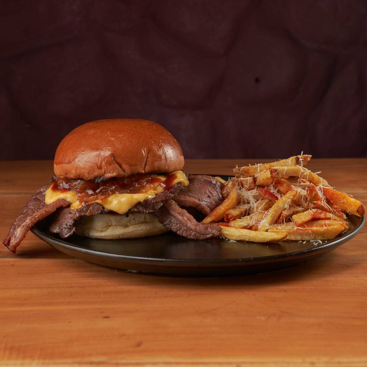 Pan artesanal, 200 g de punta de anca ahumada tipo roast beef, doble queso cheddar, cebolla caramelizada y bbq de la casa; acompañada de papas a la francesa.