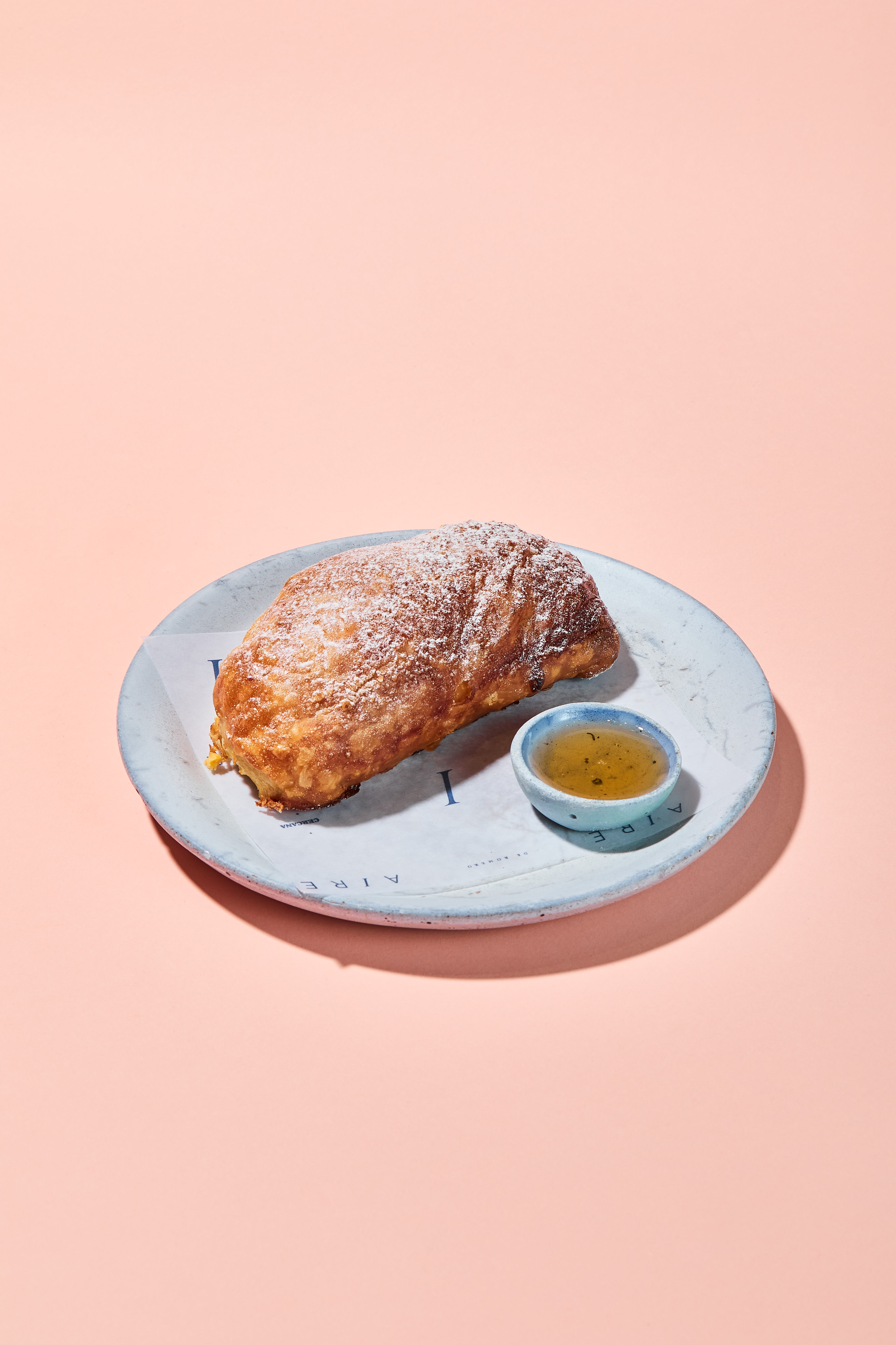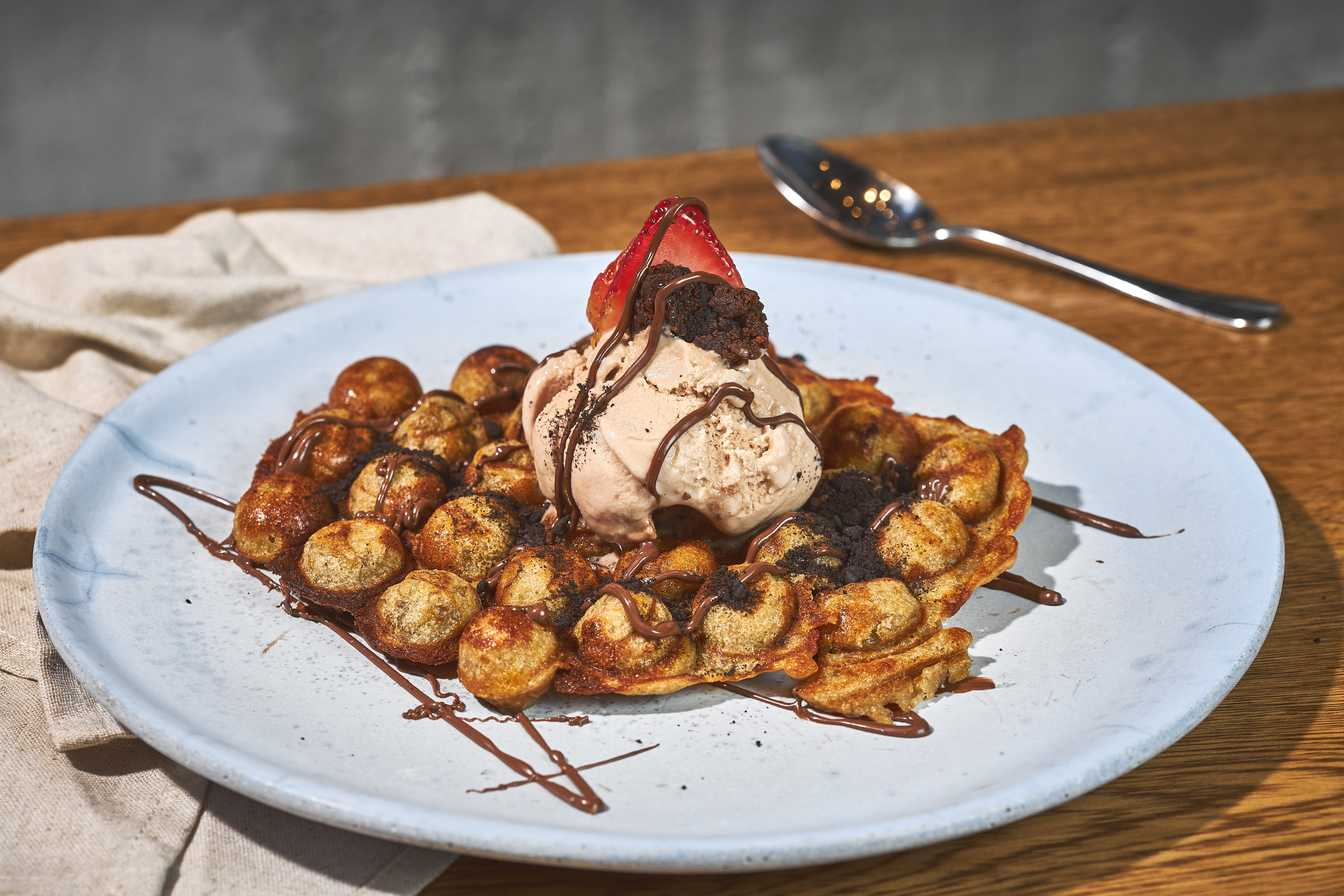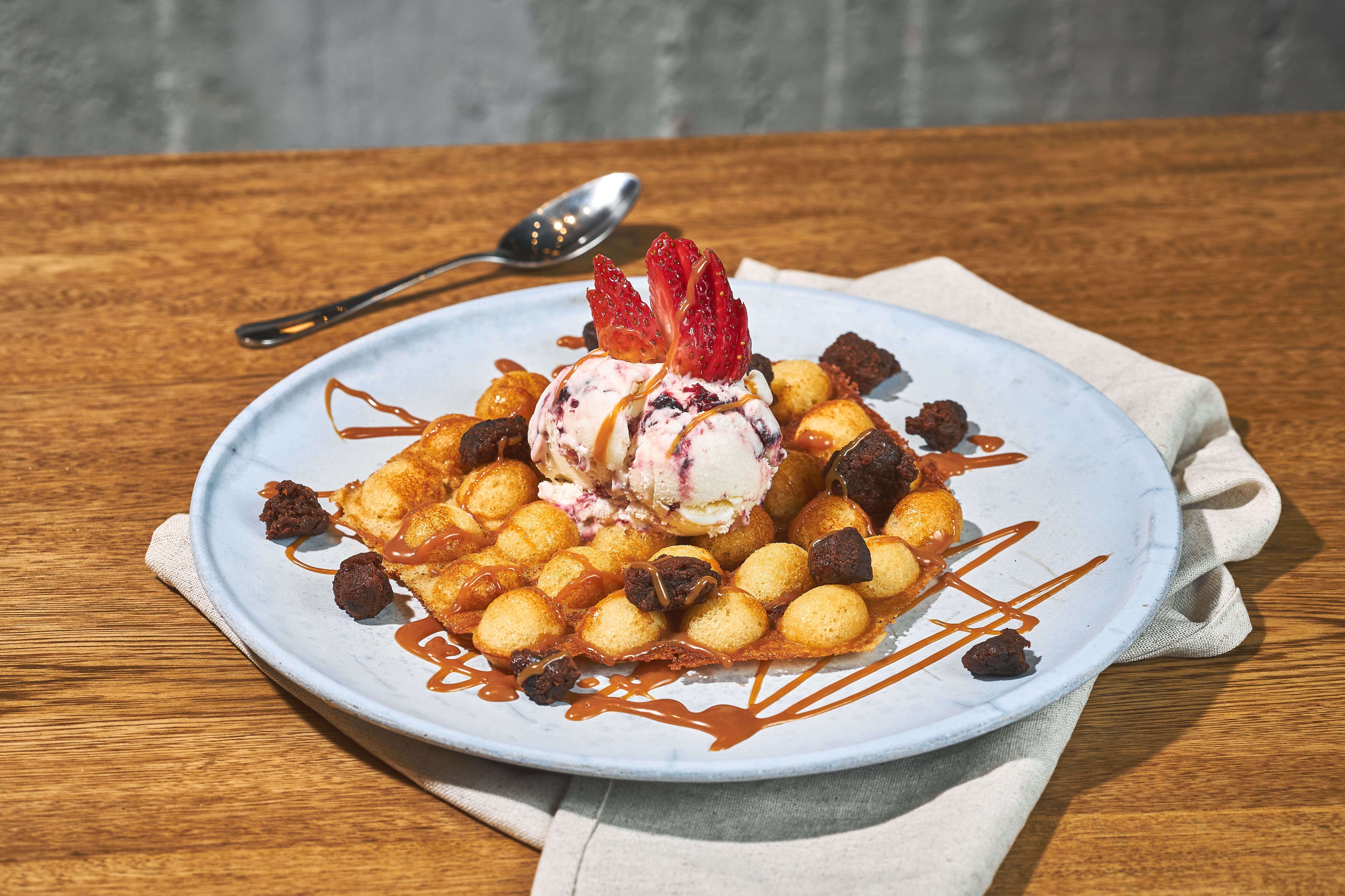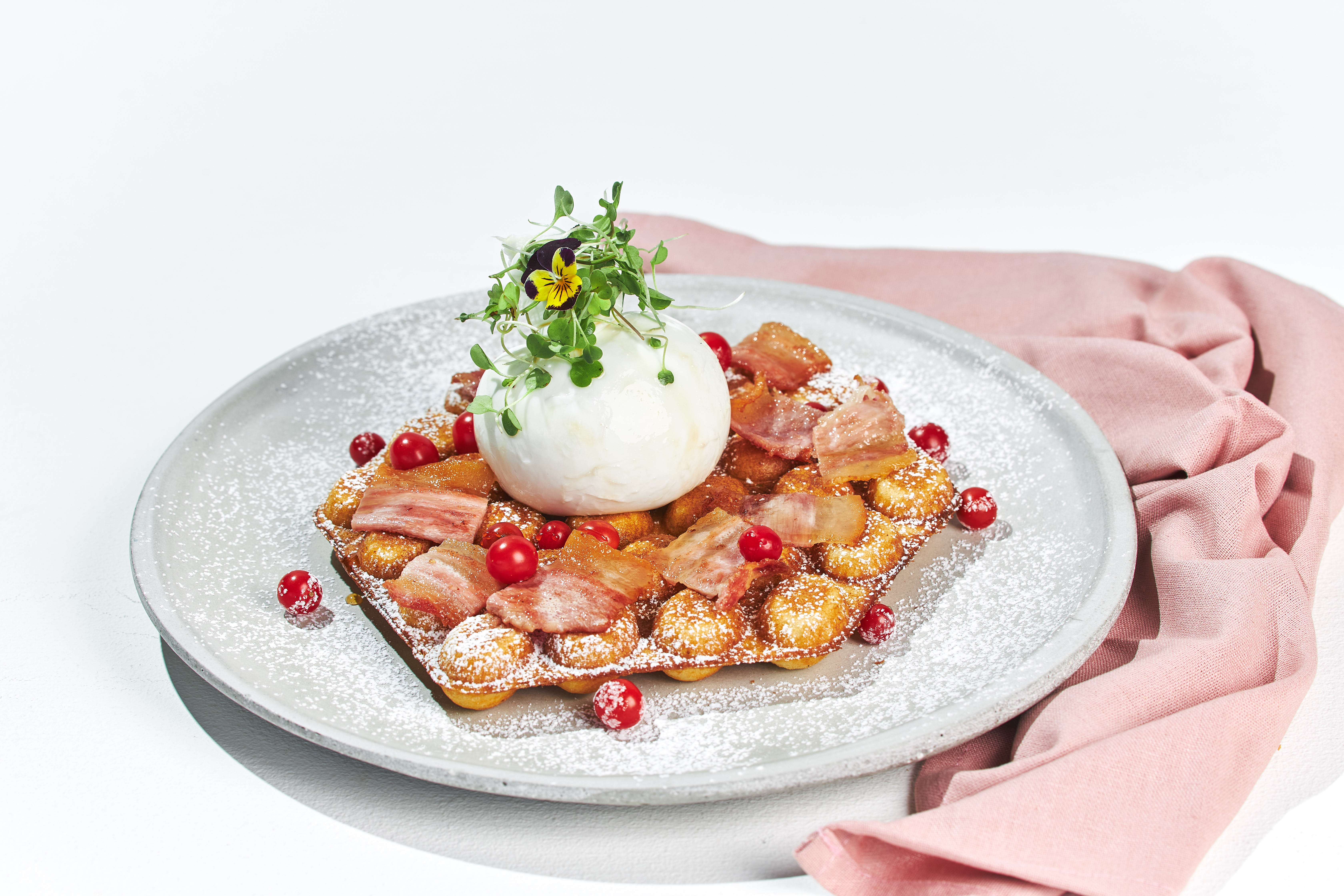 Creativa, deliciosa y crocante base de pan de yuca hecha waffle, con mozzarella de búfala rellena de crema acompañada de tocineta troceada y tomates perla, finalizada con miel de abejas pura y brotes frescos.