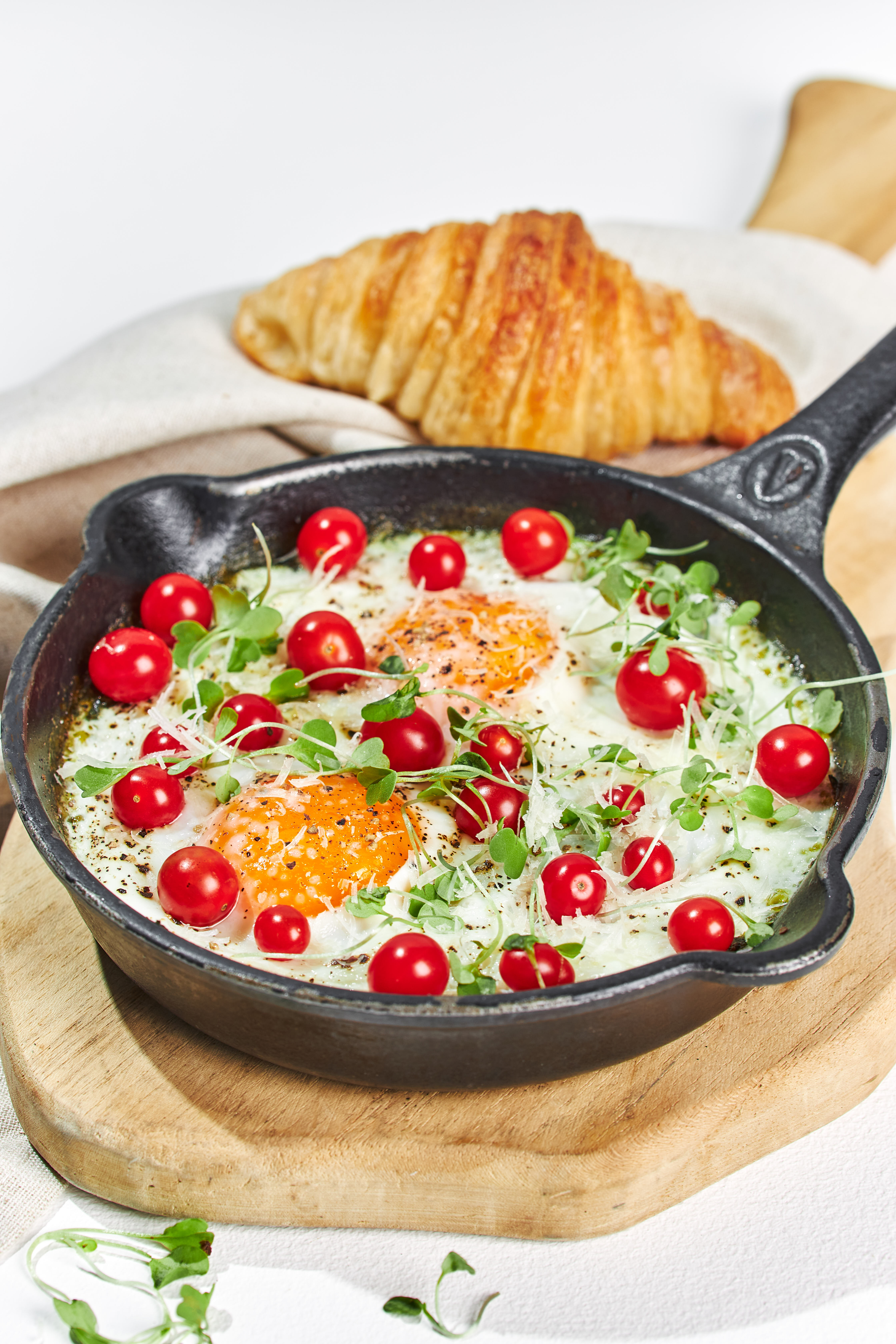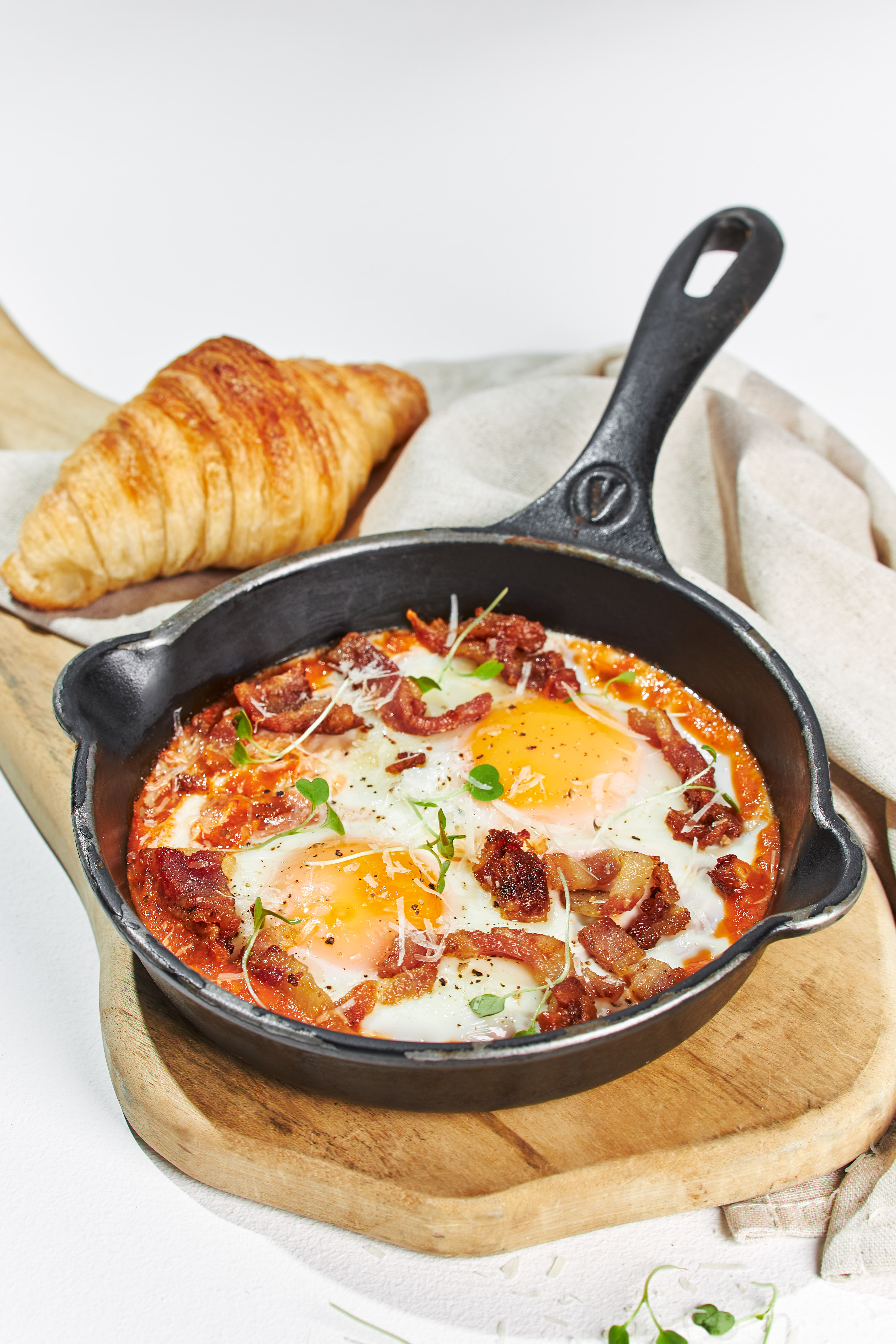 Huevos en cacerola finalizados al horno acompañados de un fresco croissant de mantequilla, sobre una base de delicioso pomodoro artesanal, finalizado con parmesano, tocineta troceada y brotes frescos.