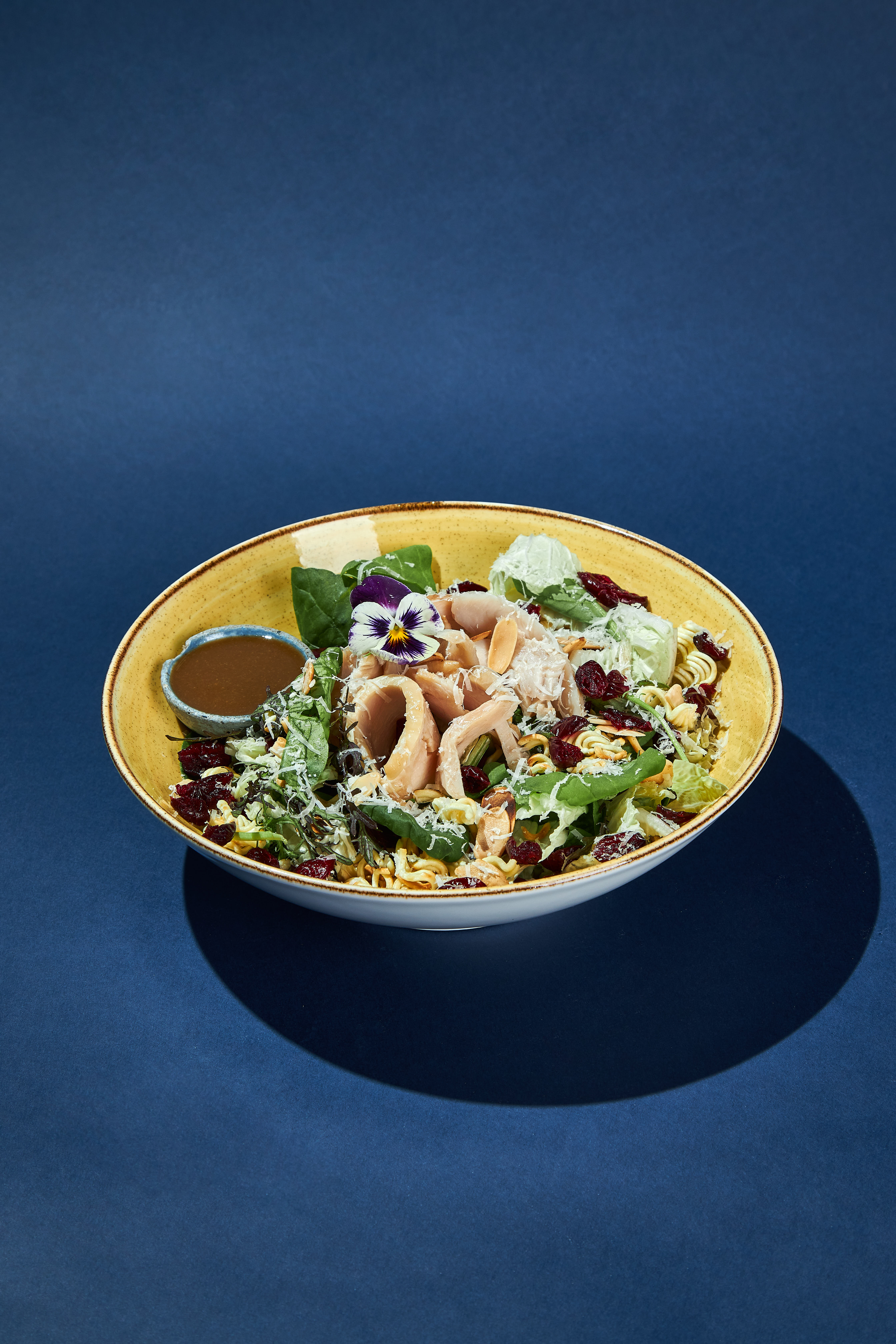 Mezcla fresca de brotes de hojas y colchina bañadas en vinagreta balsámica. Acompañado de deliciosa pechuga de pavo en lonjas hecha en casa, arándanos deshidratados, almendras y pasta tostadas, finalizado con queso parmesano rallado.