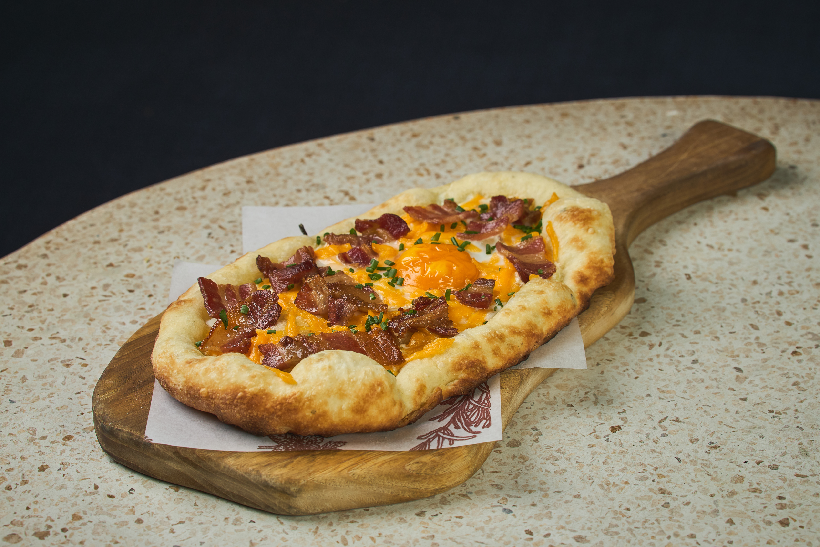Una pizzeta de masa delgada y crocante, con una deliciosa tocineta crujiente, queso cheddar, huevo y cebollín.
