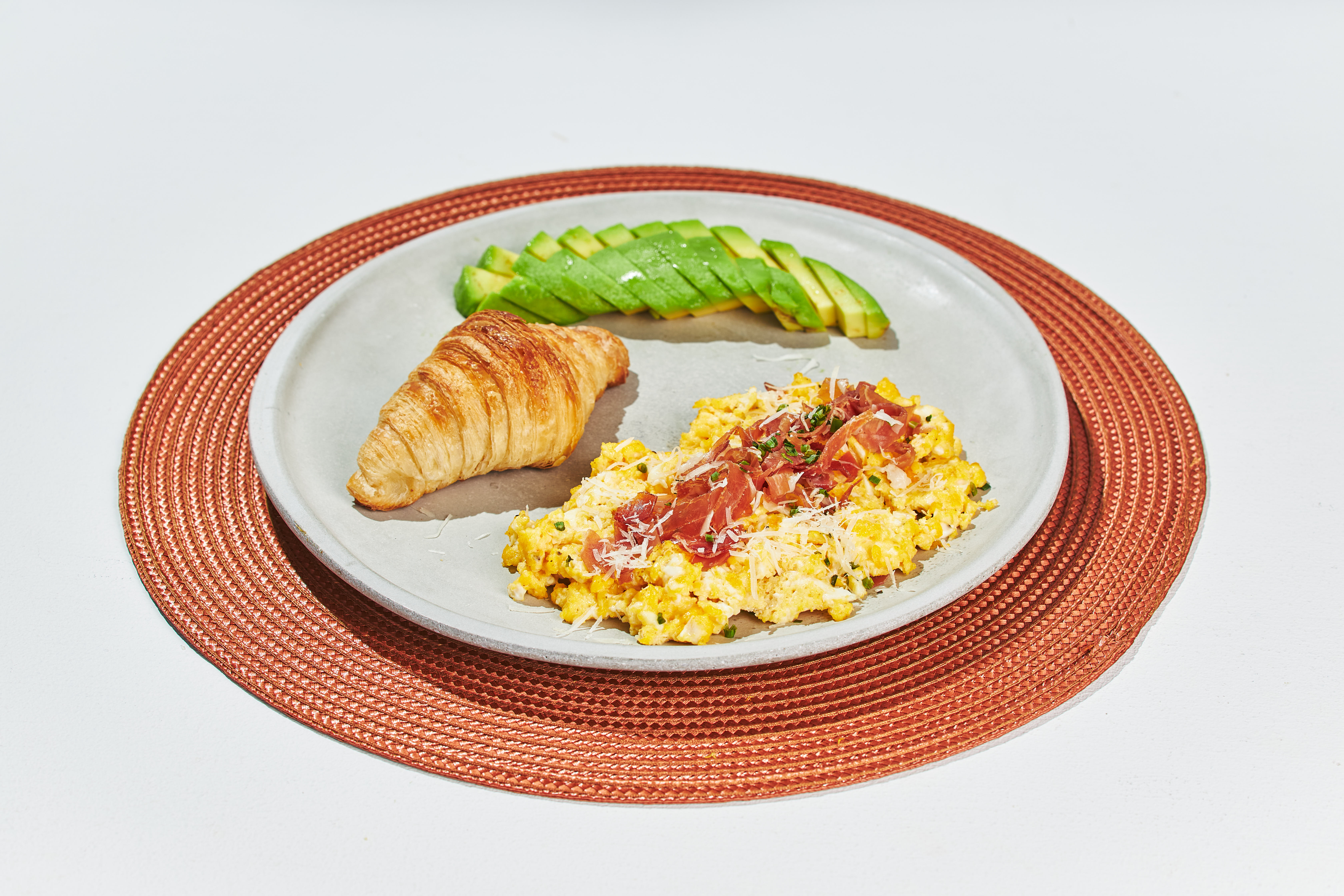 Huevos ligeramente batidos con queso parmesano y crema, finalizados con cebollín; acompañados de aguacate fresco y croissant de mantequilla. Puedes pedirlo con tu proteína favorita a elección.