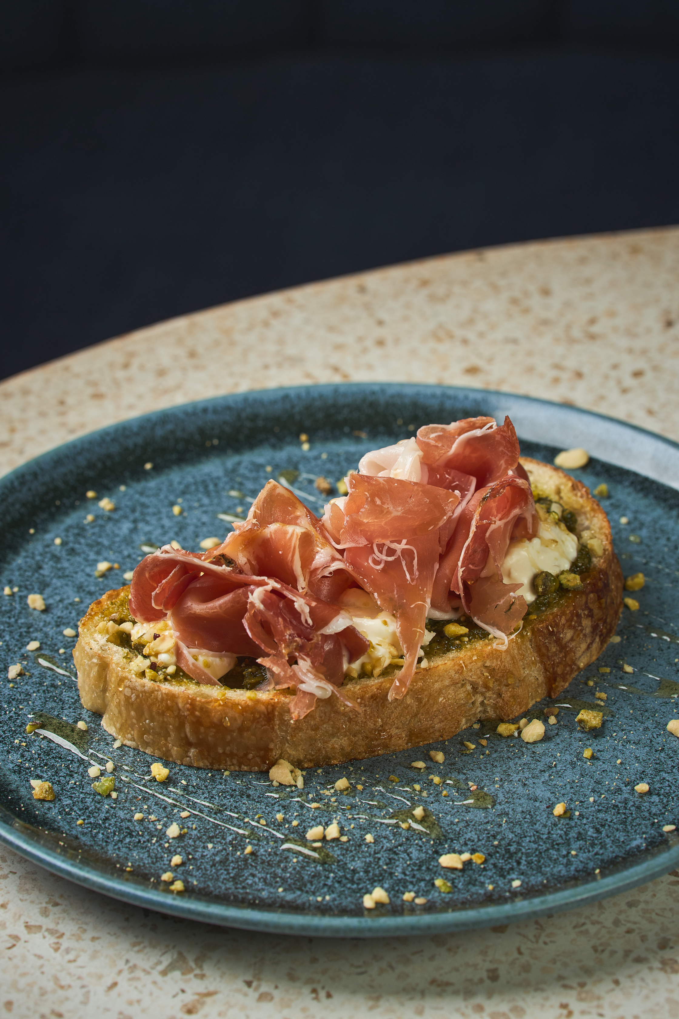 Stracciatella cremosa, pesto de pistacho, tomates cocidos sobre pan crujiente. Cremosa, crocante, intensa.