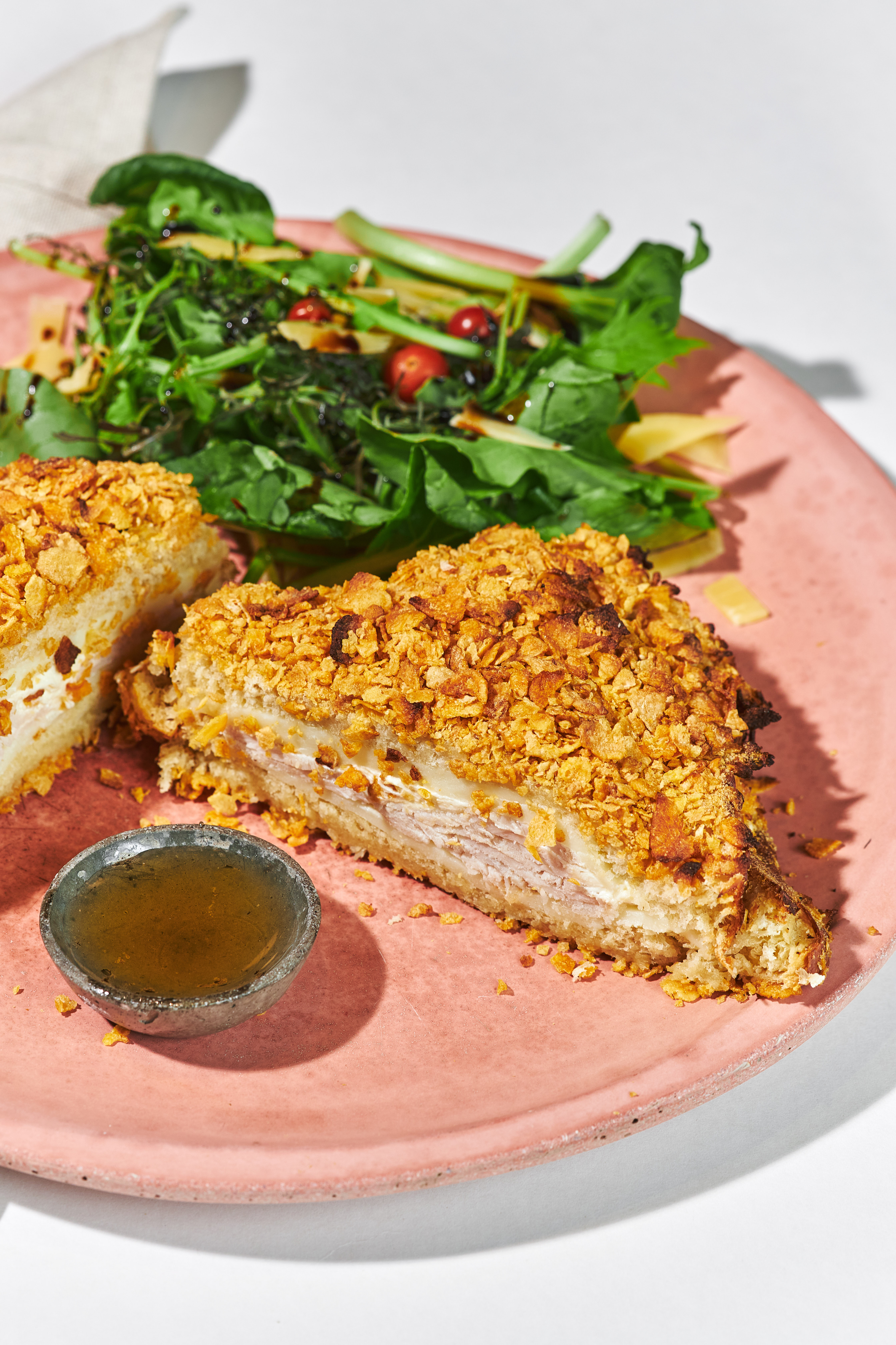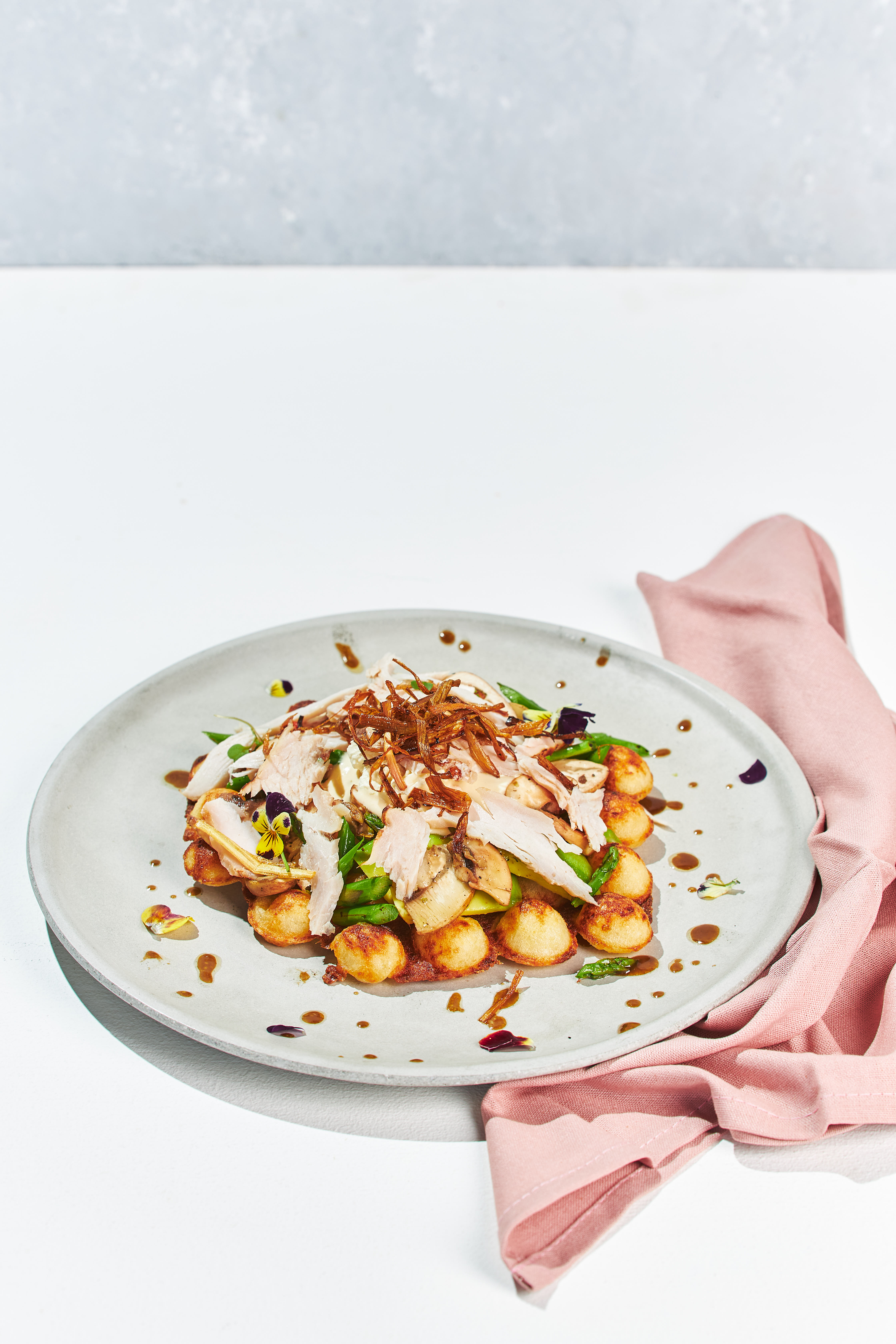 Creativa, deliciosa y crocante base de pan de yuca hecha waffle, con pechuga de pavo en lonjas hecha en casa, aguacate fresco, champiñones y espárragos salteados finalizado con una combinación de dip de eneldo, reducción balsámica y cipolla.