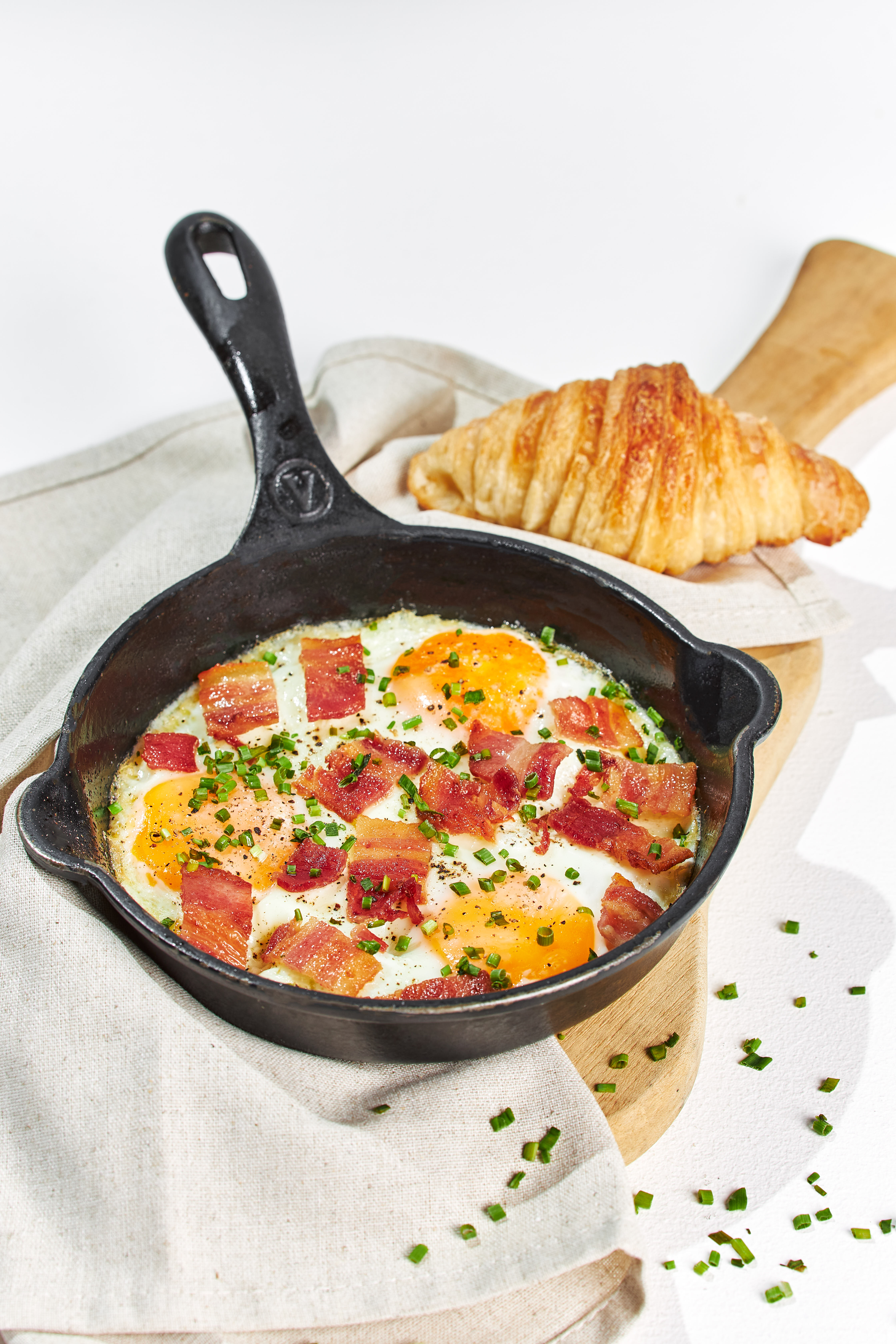 Huevos en cacerola finalizados al horno acompañados de un fresco croissant de mantequilla, tocineta troceada, cebollín y queso parmesano.