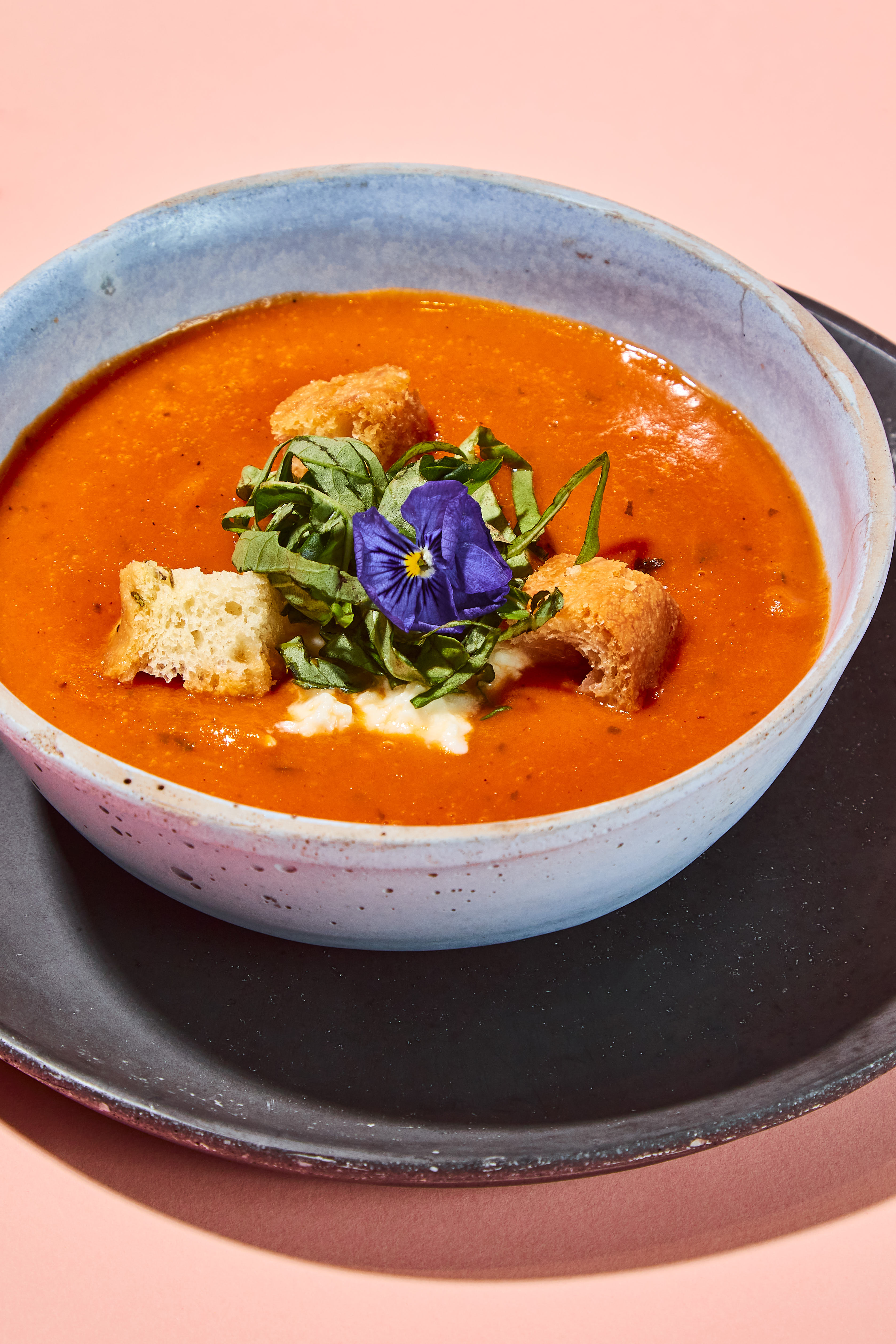 Crema de tomate natural, acompañada con crutones y queso feta.