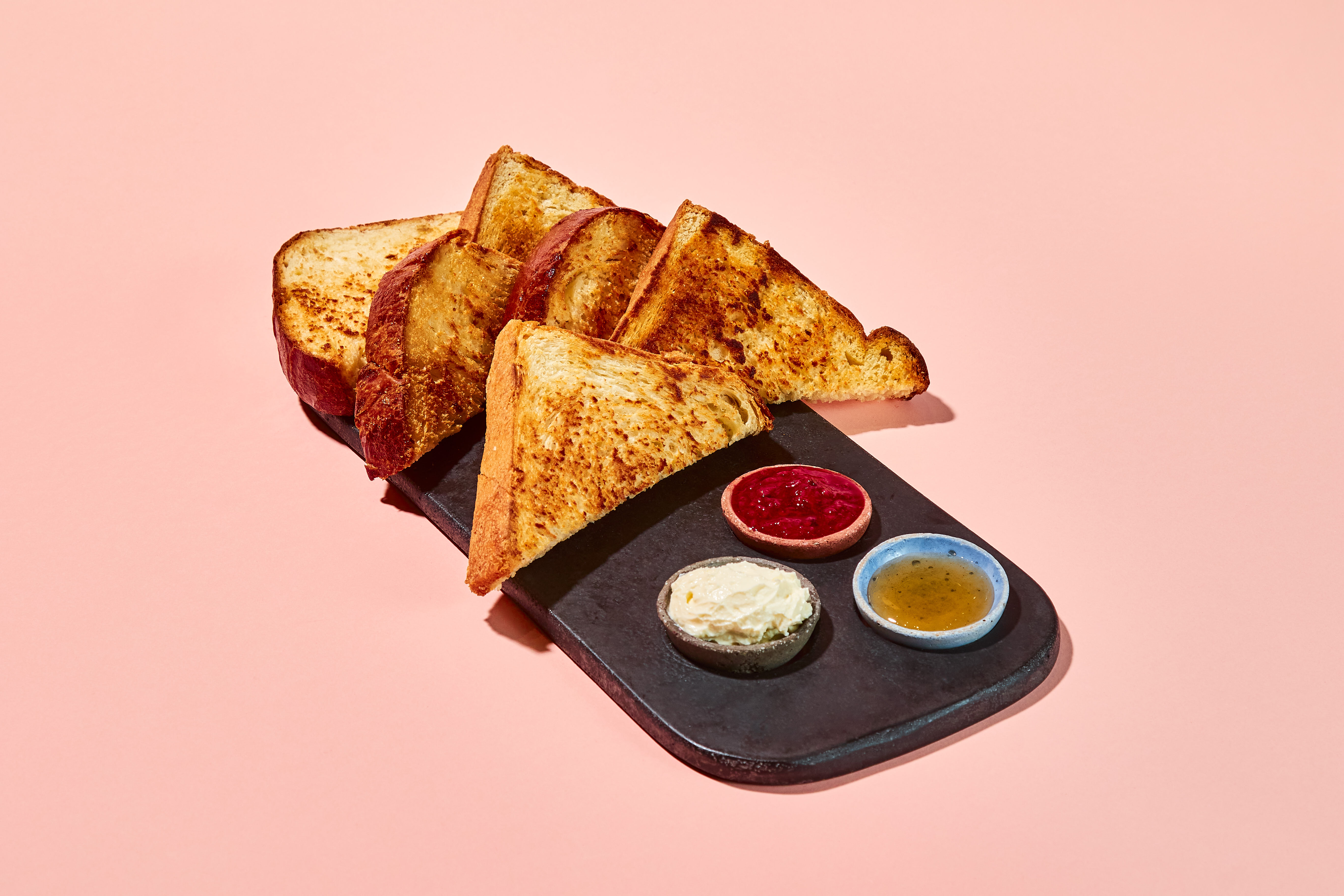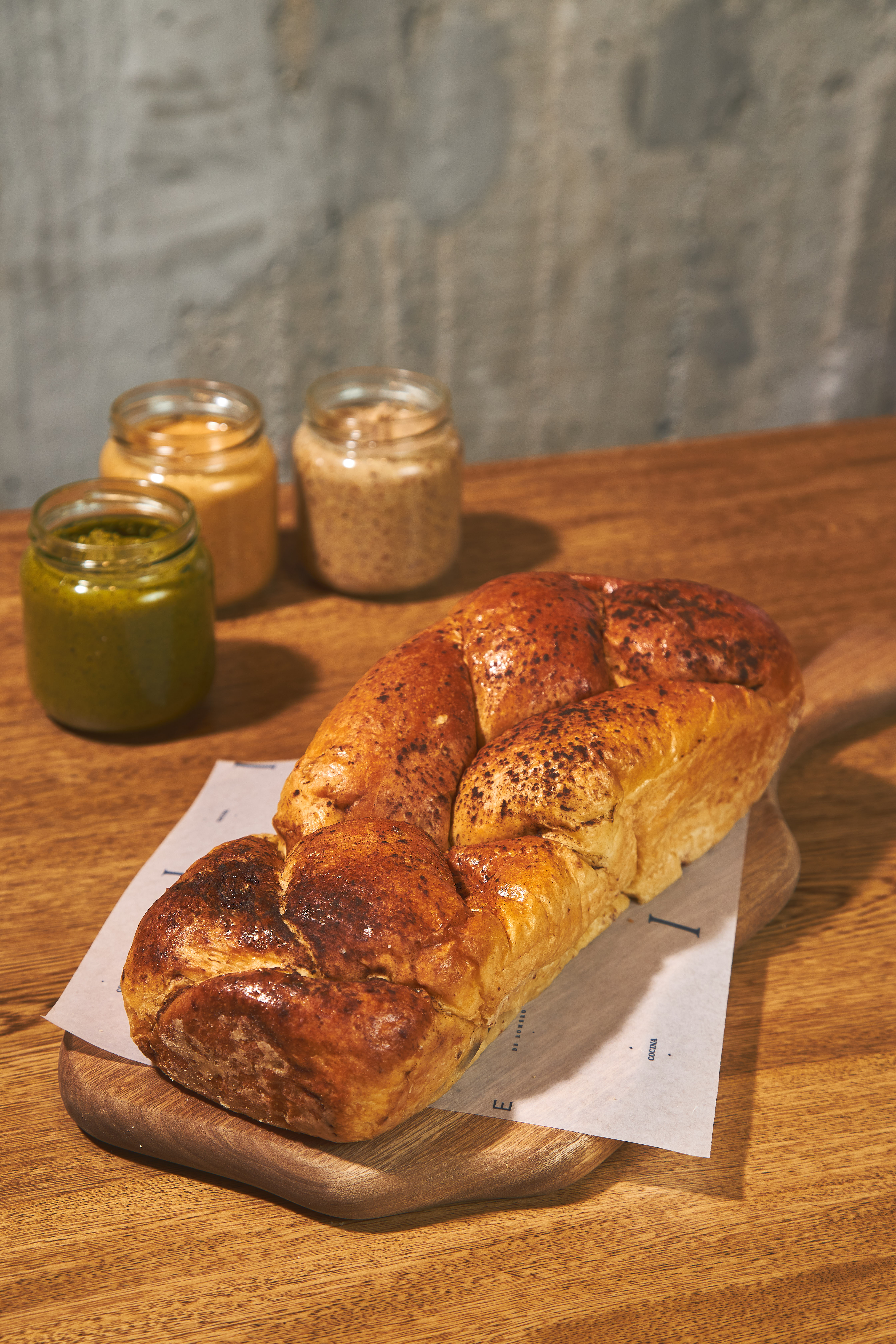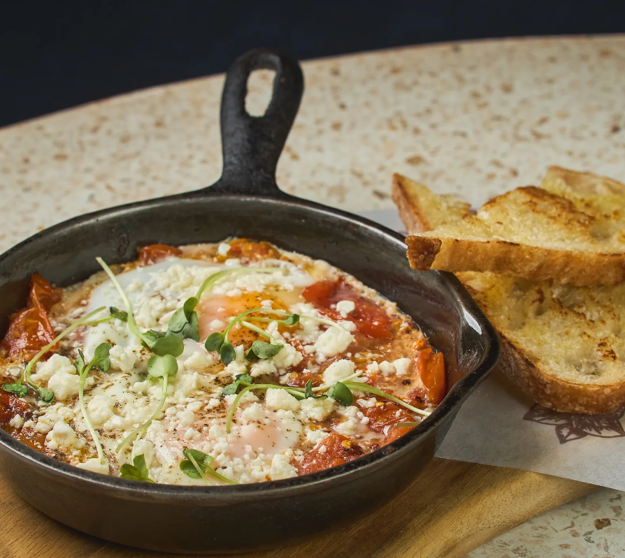 Una oda al desayuno con alma italiana. Dos huevos suaves cocidos al horno sobre una cama de tomates uvalina en cocción lentamente y un toque picante. Acompañados de pan de masa madre para sumergir en cada bocado.