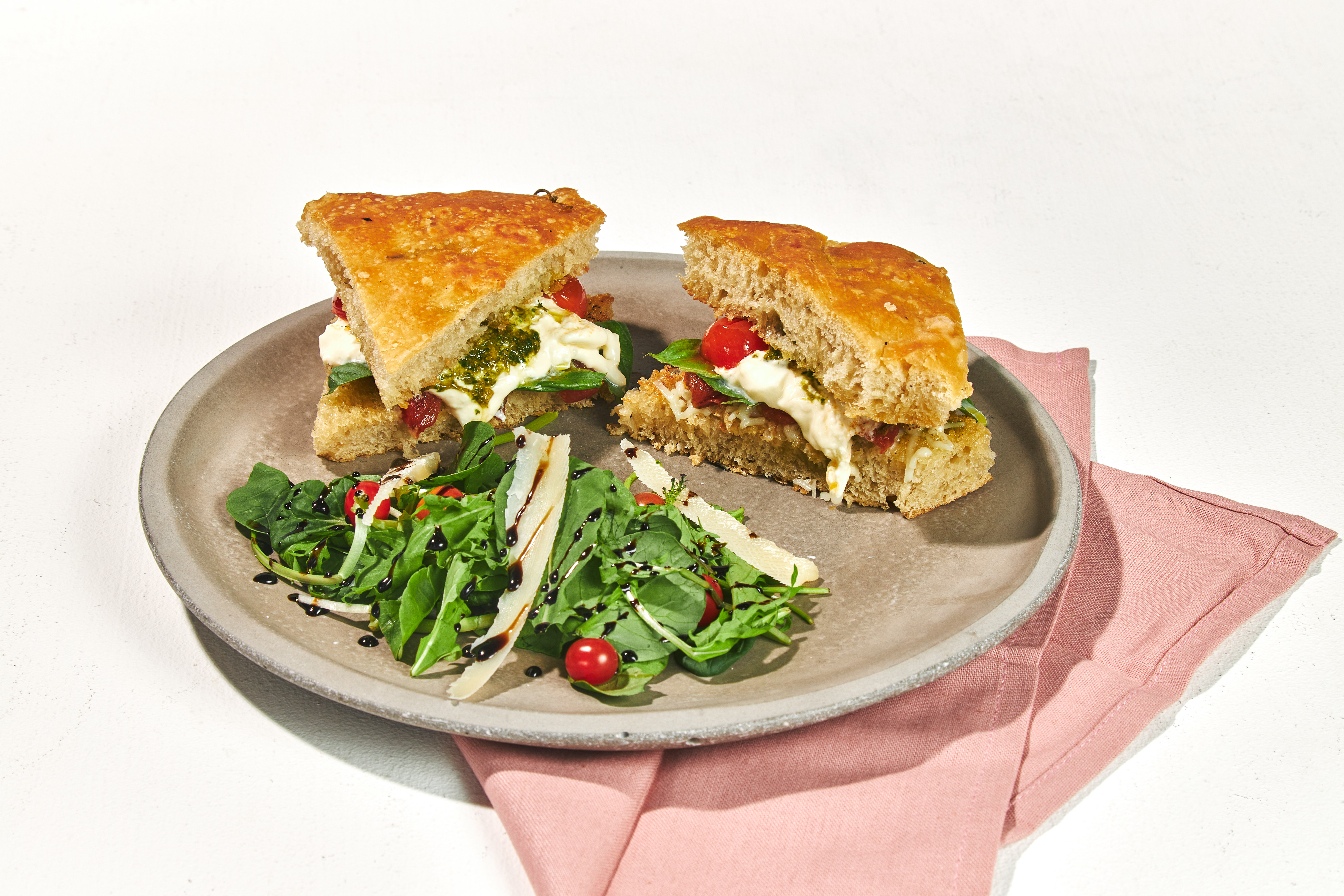 Con salsa pesto artesanal, queso mozzarella, mezcla de tomates confitados, tomates cherry y albahaca fresca, elaborados con delicioso pan focaccia artesanal o tortilla integral a elección y el acompañante que prefieras.