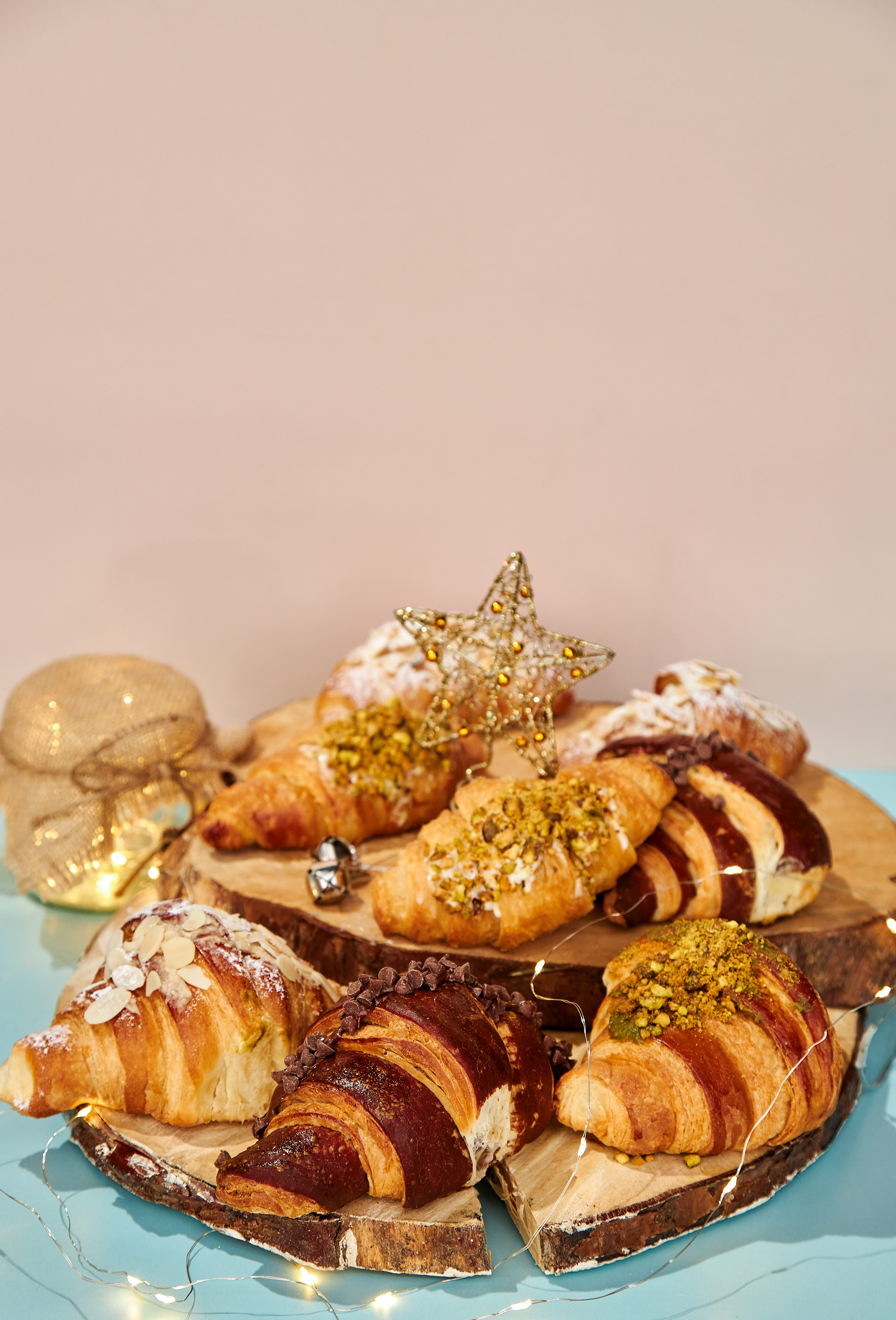 Huevos en cacerola finalizados al horno acompañados de un fresco croissant de mantequilla, sobre una mezcla artesanal de mix de espinaca finalizado con tomates perla, queso parmesano y brotes frescos.
