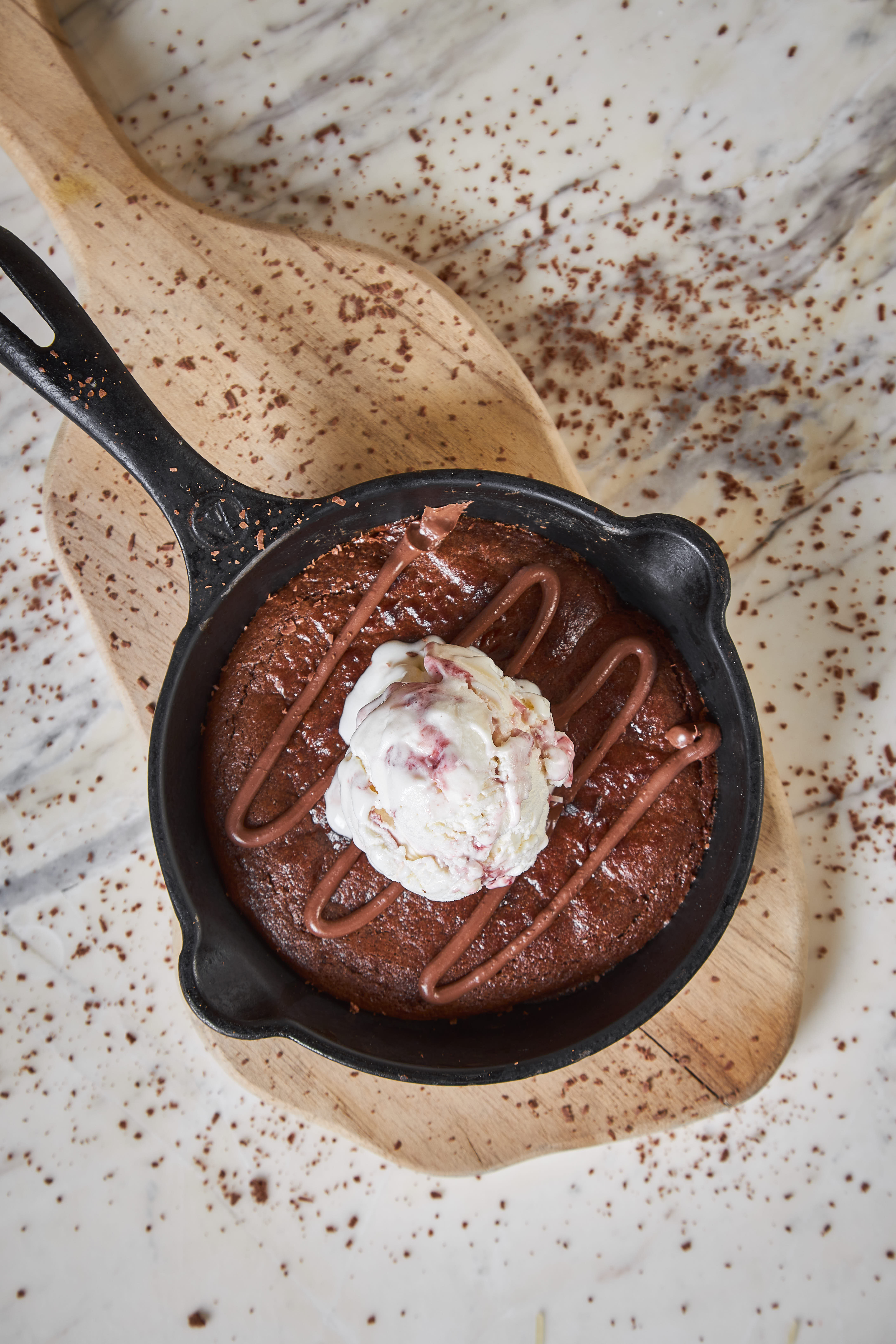 Deliciosa galleta de chocolate con macadamia y chocolate blanco, acompañada de gelato a elección y ralladura de limón.