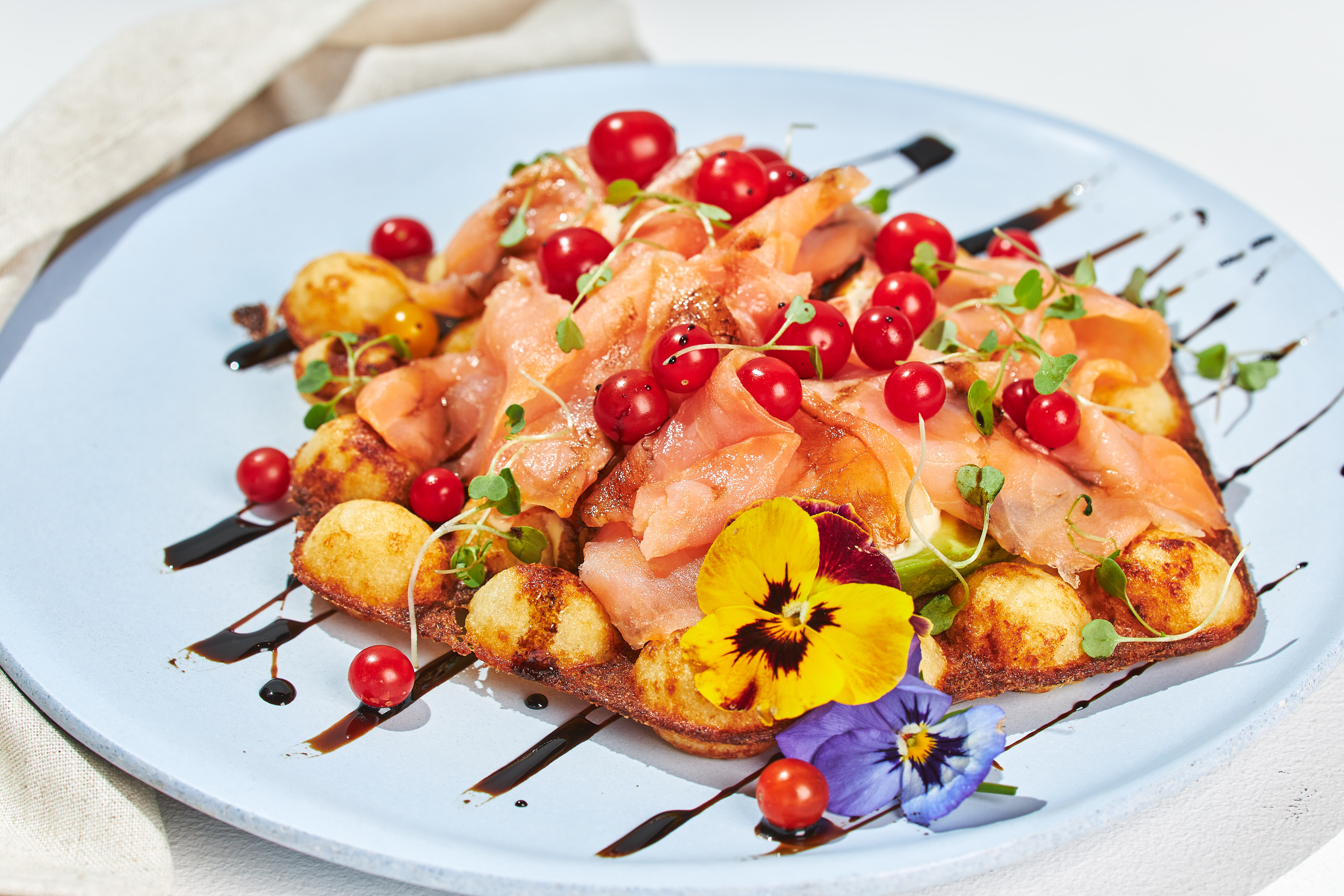 Creativa, deliciosa y crocante base de pan de yuca hecha waffle, con finas lonjas de salmón ahumado, aguacate fresco y tomates perla. Con delicioso dip de eneldo, reducción balsámica y brotes frescos.