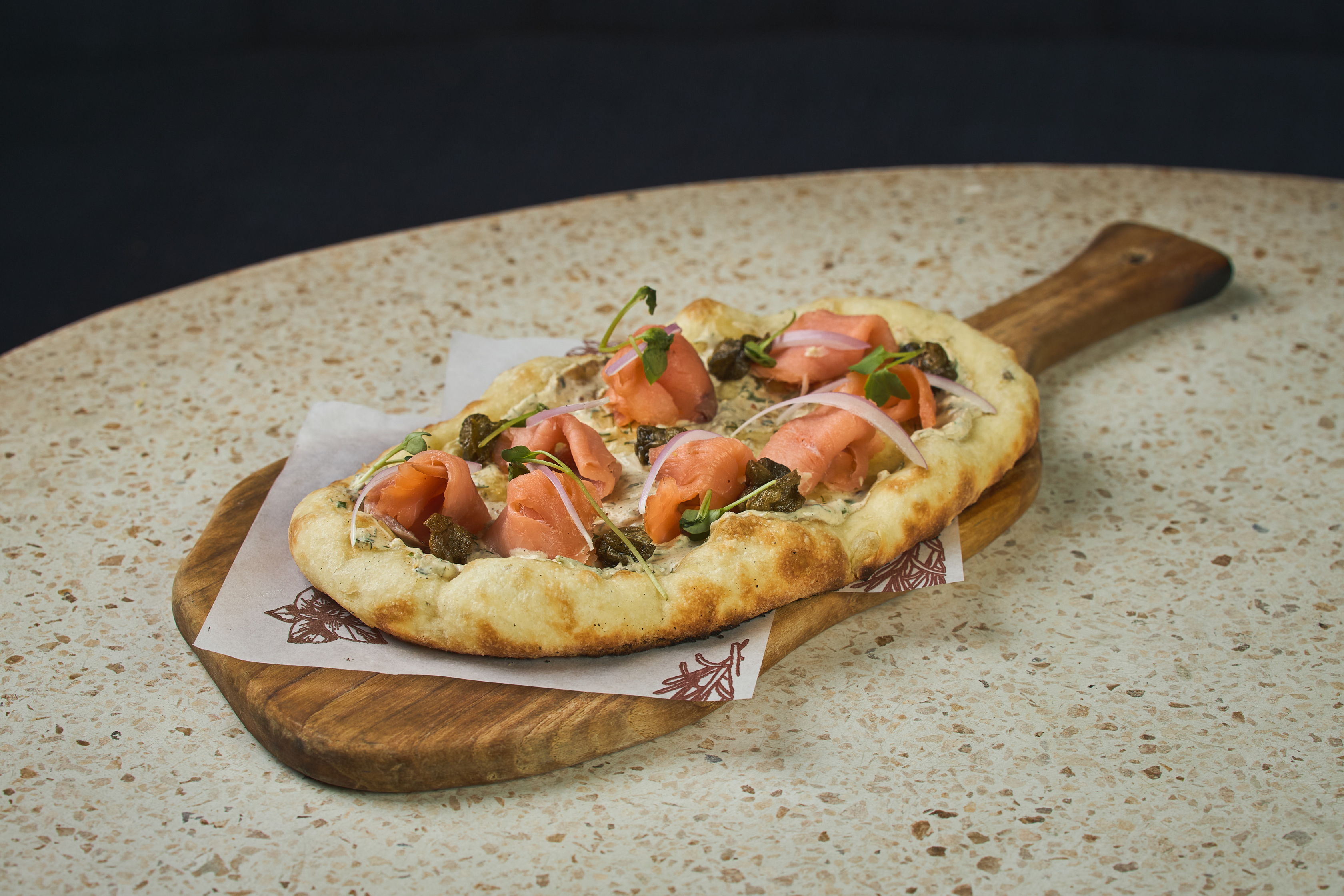 Nuestra pizzeta con una espectacular combinación de salmón ahumado, dips de eneldo, alcaparras fritas, cebolla morada y coronado con brotes de rúgula.