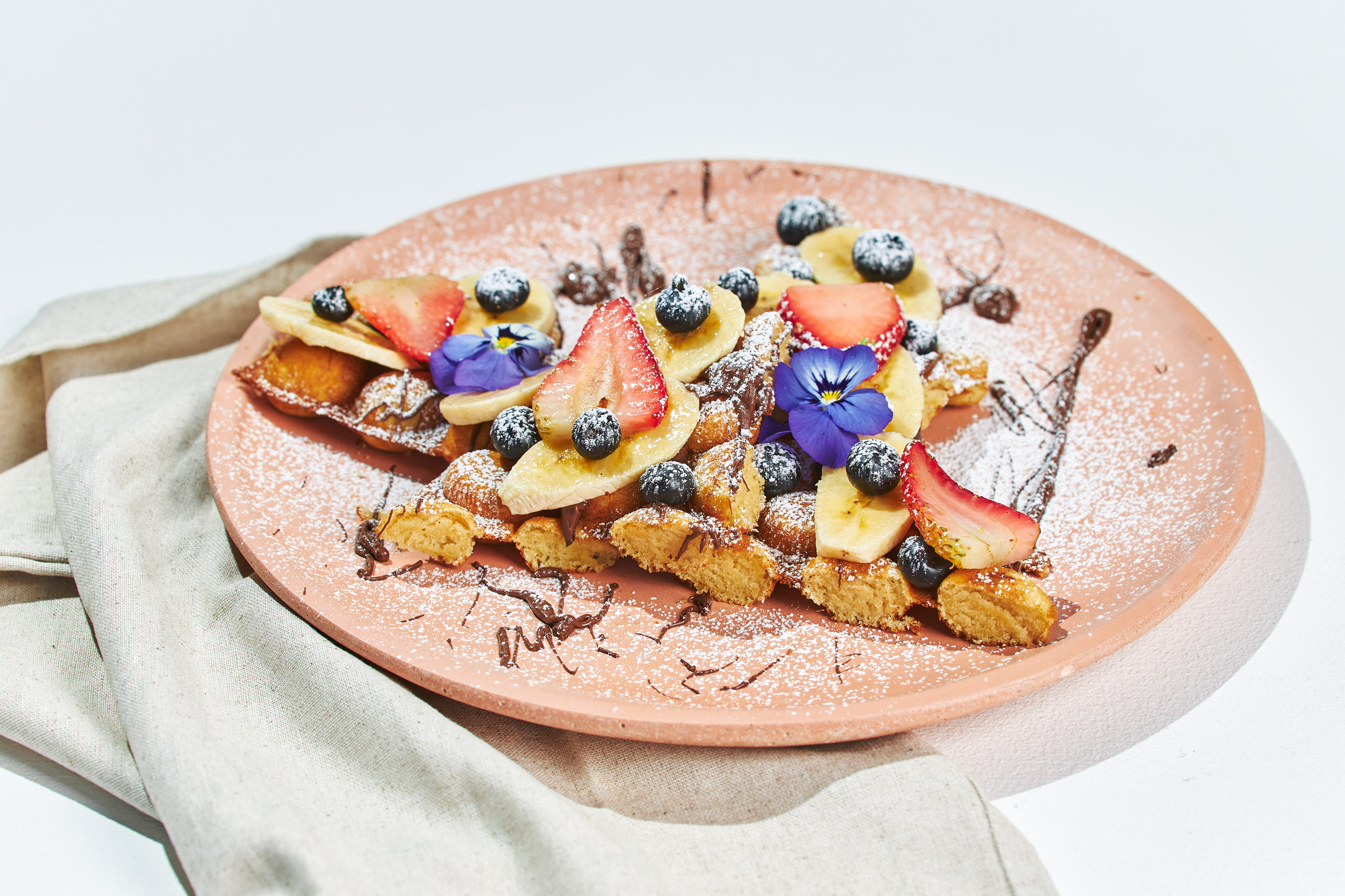 Base de waffle natural, banano o pan de yuca, con mezcla de deliciosas fresas, arándanos y bananos frescos, nutella, mermelada de frutos rojos y miel. Finalizada con azúcar glass.