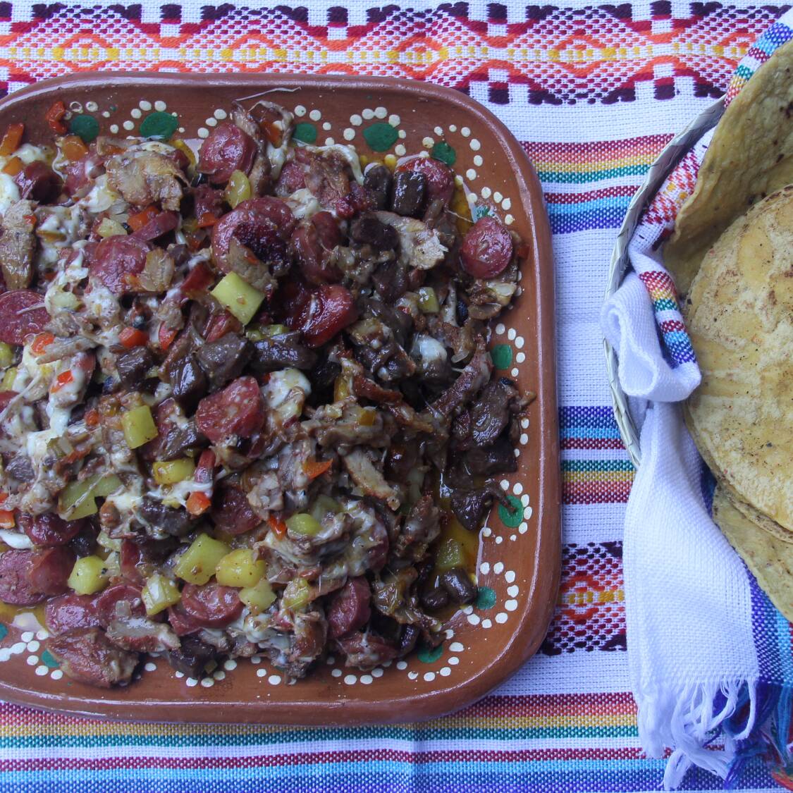 Variedad de tipos de carne al estilo México, carne al pastor, lomo fino de res, chorizo ahumado, carnitas michoacanas, cubierto con queso derretido. Incluye porción individual de guacamole y 12 tortillas de maíz. Ideal para 2 personas. (500gr)