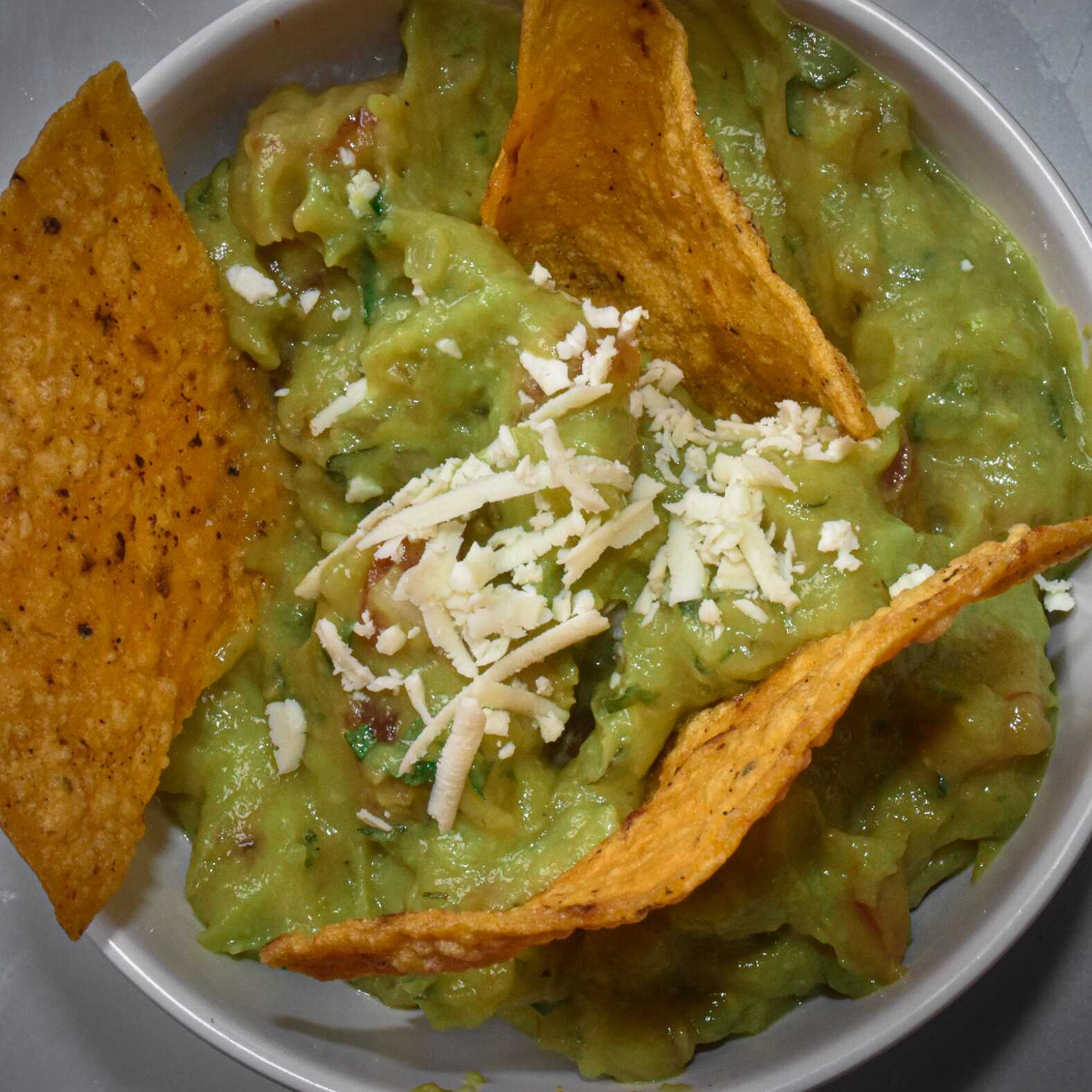 Pulpa de aguacate mezclado con cebolla, tomate y cilantro. Acompañado con totopos crocantes.
