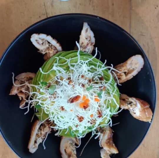 Sushi de calamar apanado, queso crema, puerro crocante, cubierto de aguacate en láminas, mayonesa japonesa, sryrasha y mayonesa de ají.
