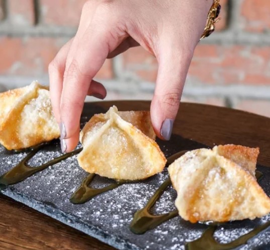Wanton frito relleno de lyches y crema de arequipe.