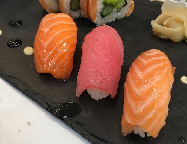 Sushi con palmito kanikama, puerro confitado, aguacate, atún picante, mayonesa japonesa y tobiko.