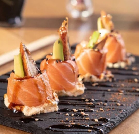 Sushi con salmón, piel de salmón crocante, queso crema, aguacate, salsa de anguila y caviar de maracuyá.