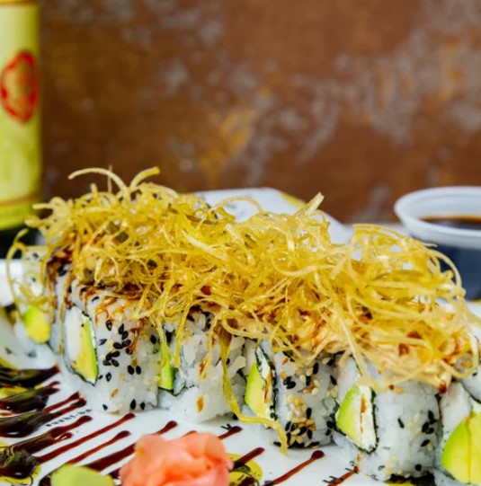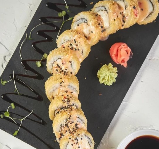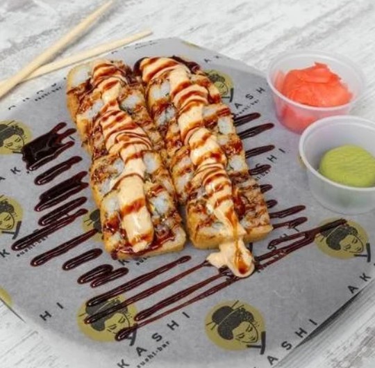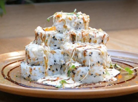 Arroz, aguacate, queso crema, kanikama apanado, mayo sweet chilli, teriyaki, ajonjolí y cebollín acompañado por nuestra salsa isaku.