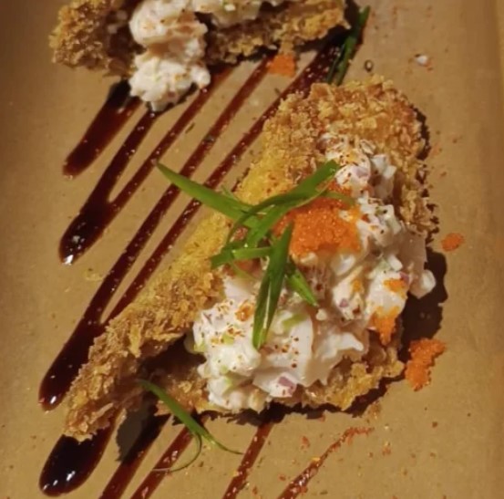Rollo apanado en panko, relleno de mango, cebollín, aguacate y queso crema, topping de langosta acevichada, caviar de soya, mango y cilantro.