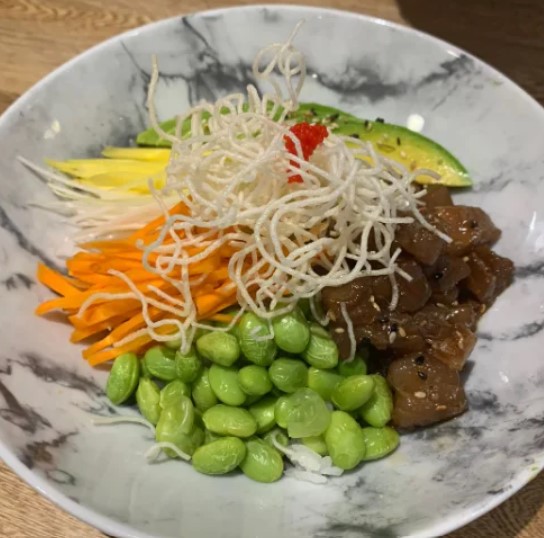 Arroz, atún macerado en aceite de ajonjolí, soya y miel, aguacate, mango, zanahoria, edamames desgranados, puerro, vermicelly de arroz frito, masago, ajonjolí y cebollín acompañado por la salsa isaku.