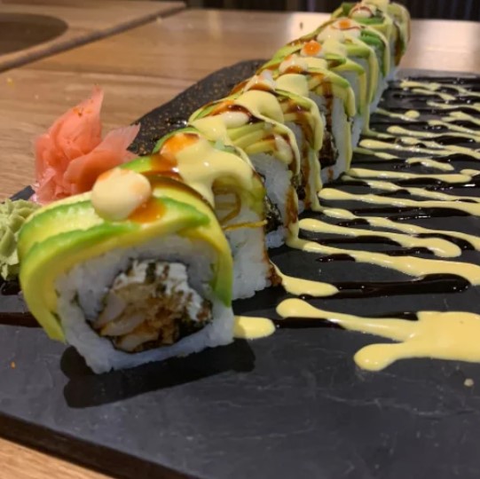Sushi de calamar apanado, queso crema, puerro crocante, cubierto de aguacate en láminas, mayonesa japonesa, sryrasha y mayonesa de ají.