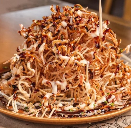 Palmito japonés deshilachado y apanado, salsa de sweet chili, queso crema y sryrasha.