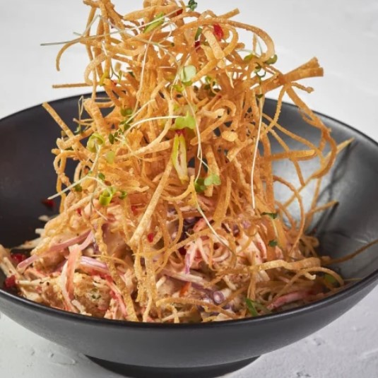 Piel de salmón apanada en panco con cremoso de camarón y salmón, sryrasha, cebolla fresca, apio y masago.