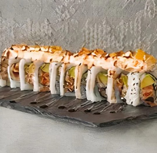 Rollo tempurizado de langostino, salmón, anguila, salmón ahumado, aguacate, queso crema y salsa dragón.