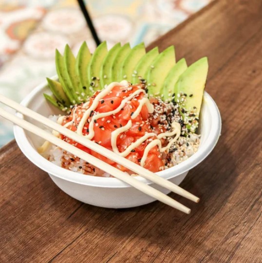 Bowl con arroz camarón tempura, salmón, atún, wakame, mango, aguacate, mayonesa de sweet chili, sryracha y espuma dinamita.